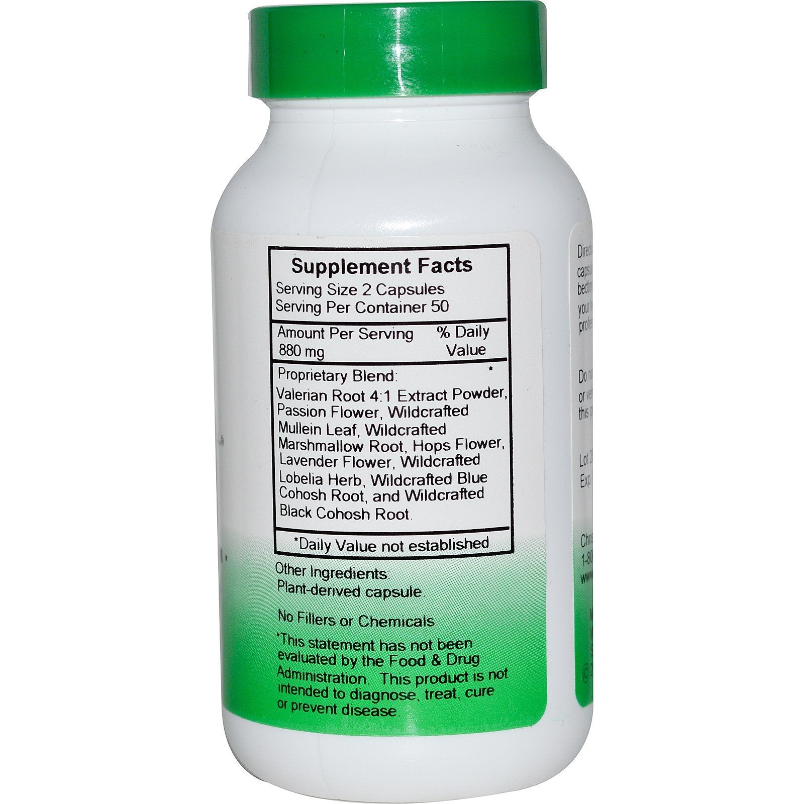 Dietary Supplement A synergistic blend of time tested herbs for nervous system function.Sugg. UseTake up to 2 capsules daily before bedtime or as directed by your health care professional.Other IngredientsPlant-derived capsule. No fillers or chemicals.Supplement FactsServing Size: 2 Capsules Servings Per Container: 50 Amount Per Serving % Daily Value Valerian Root 4:1 Extract Powder, Passion Flower, Wildcrafted Mullein Leaf, Wildcrafted Marshmallow Root, Hops Flower, Lavender Flower, Wildcrafted Lobelia Herb, Wildcrafted Blue Cohosh Root, and Wildcrafted Black Cohosh Root. 880 mg * *Daily Value not established.DisclaimerWhile VitaminsUK strives to ensure the accuracy of its product images and information, some manufacturing changes to packaging and/or ingredients may be pending update on our site. Although items may occasionally ship with alternate packaging, freshness is always guaranteed. We recommend that you read labels, warnings and directions of all products before use and not rely solely on the information provided by VitaminsUK.