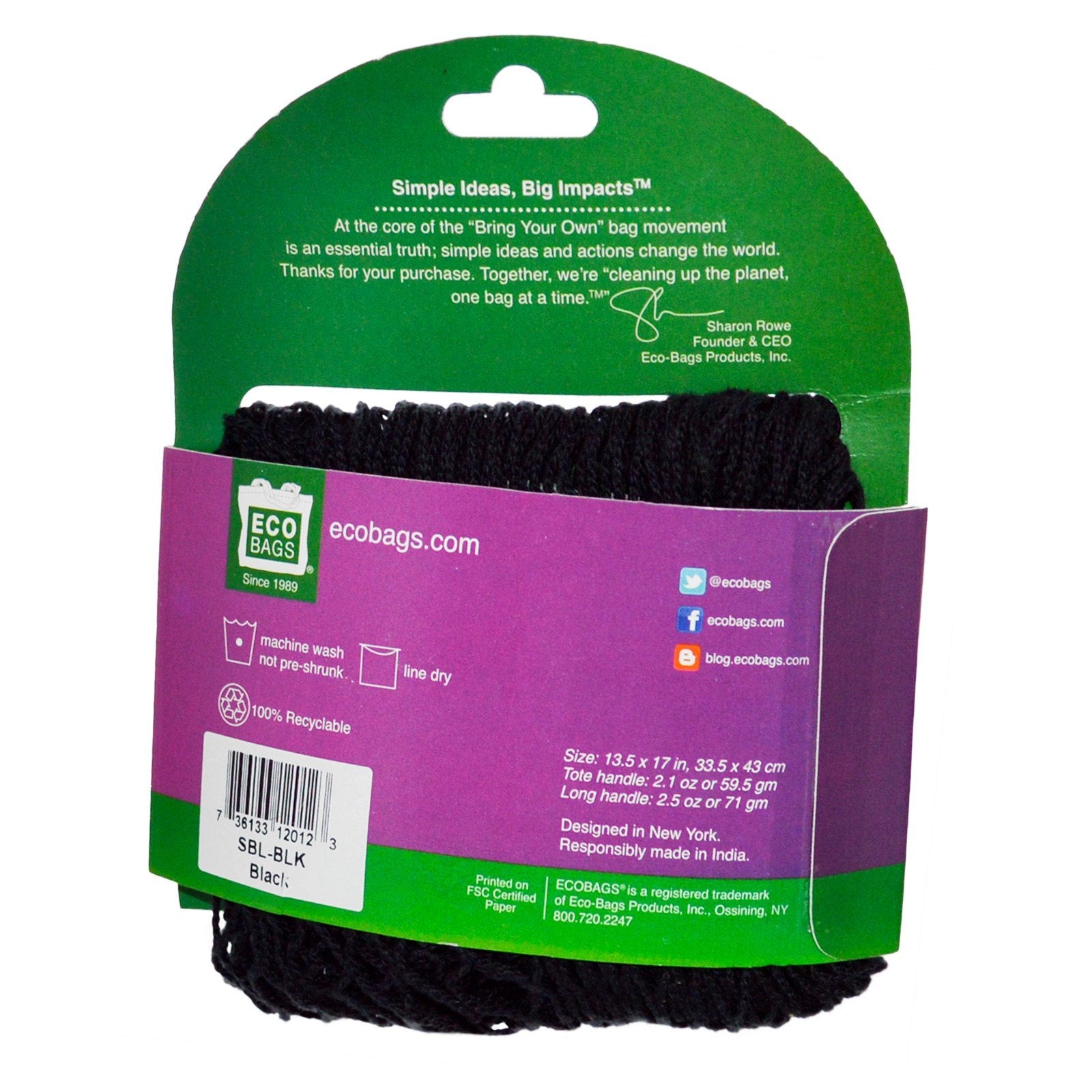 Cleaning Up the Planet, One Bag at a Time Chic Everyday Bag for Groceries, Errands, Beach & Travel 100% Natural Cotton, with Azo-Free Dyes Expands to Hold 40 lb, 18 kg Reusable Recyclable Smart Simple Ideas, Big Impacts At the core of the "Bring Your Own" bag movement is an essential truth; simple ideas and actions change the world. Thanks for you purchase. Together, we're "cleaning up the planet, one bag at a time". — Sharon Rowe Founder & CEO Eco-Bags Products, Inc. Size: 13.5 x 17 in, 33.5 x 43 cm Long handle: 2.5 oz or 71 gmSugg. UseMachine wash not pre-shrunk Line dryOther IngredientsSupplement FactsDisclaimerWhile VitaminsUK strives to ensure the accuracy of its product images and information, some manufacturing changes to packaging and/or ingredients may be pending update on our site. Although items may occasionally ship with alternate packaging, freshness is always guaranteed. We recommend that you read...