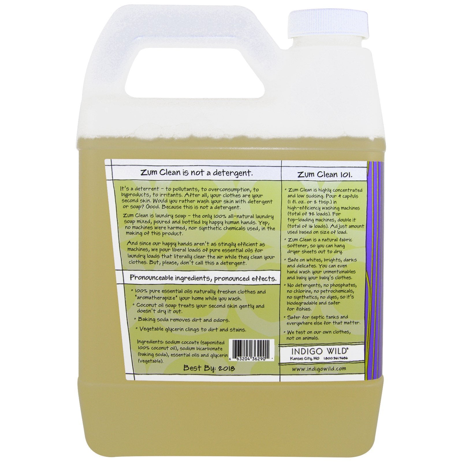 Cleans 32 Loads! h·e Highly Concentrated Maid by Nature. Highly concentrated Great for high-efficiency machines Handmade with pure essential oils Free of synthetic chemicals Zum Clean is not a detergent. It's a deterrent - to pollutants, to overconsumption, to byproducts, to irritants. After all, your clothes are your second skin. Would you rather wash your skin with detergent or soap? Good. Because this is not a detergent. Zum Clean is laundry soap - the only 100% all-natural laundry soap mixed, poured and bottled by happy human hands. Yep, no machines were harmed, nor synthetic chemicals used, in the making of this product. And since our happy hands aren't as stingily efficient as machines, we pour liberal loads of pure essential oils for laundry loads that literally clear the air while they clean your clothes. But, please, don't call this a detergent. Pronounceable ingredients, pronounced effects. 100% pure essential oils naturally freshen clothes and "aromatherapize" your home while you wash. Coconut oil soap treats your second skin gently and doesn't dry it out. Baking soda removes dirt and odors. Vegetable glycerin clings to dirt and stains.