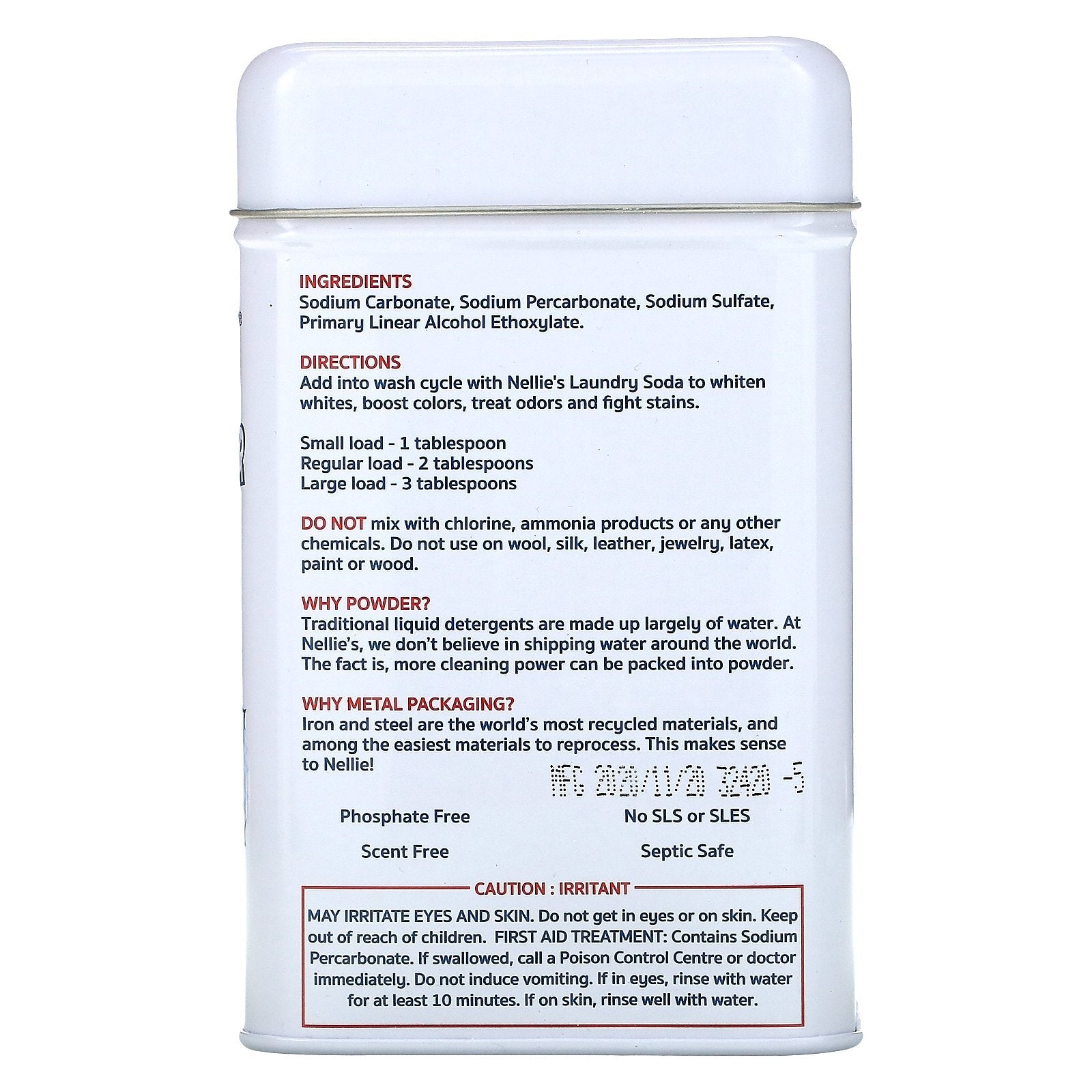 60 Scoops Leaping Bunny Certified Phosphate Free Scent Free No SLS or SLES Septic Safe Why Powder? Traditional liquid detergents are made up largely of water. At Nellie's, we don't believe in shipping water around the world. The fact is, more cleaning power can be packed into powder. Why Metal Packaging? Iron and steel are the world's most recycled materials, and among the easiest materials to reprocess. This makes sense to Nellie!Sugg. UseAdd into wash cycle with Nellie's Laundry Soda to whiten whites, boost colors, treat odors and fight stains. Small load - 1 tablespoon Regular load - 2 tablespoons Large load - 3 tablespoonsOther IngredientsSodium carbonate, sodium percarbonate, sodium sulfate, primary linear alcohol ethoxylate.Supplement FactsDisclaimerWhile VitaminsUK strives to ensure the accuracy of its product images and information, some manufacturing changes to packaging and/or ingredients may be pending update on our site. Although items may occasionally ship with alternate packaging,...
