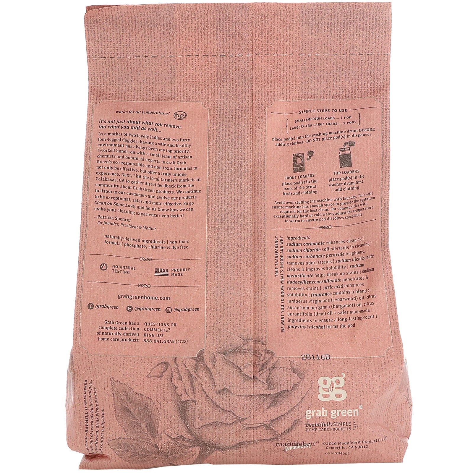 Proudly Made by Grab Green Squeeze for Fragrance Light & Flora 50 Loads Powder Pods Naturally-Derived Ingredients Non-Toxic Formula Phosphate, Chlorine & Dye Free Cleans Deeply Eliminates Odors Fight Stains Softens Naturally All Temperatures H•E Works for All Temperatures No Animal Testing Grab Green Beautifully Simple Home Care Products It's not just about what you remove, but what you add as well... As a mother of two lovely ladies and two furry four-legged doggies, having a safe and healthy environment has always been my top priority. I worked hands-on with a small team of artisan chemists and botanical experts to craft Grab Green's eco-responsible and non-toxic formulas to not only be effective, but offer a truly unique experience. Next, I hit the local farmer's markets in Calabasas, CA to gather direct feedback from the community about Grab Green products. We continue to listen to our customers and evolve our products to be exceptional, safer and more effective. So go Clean on Some Love, and let us know how we can make your cleaning experience even better! - Patricia Spencer Co-founder, President & Mother