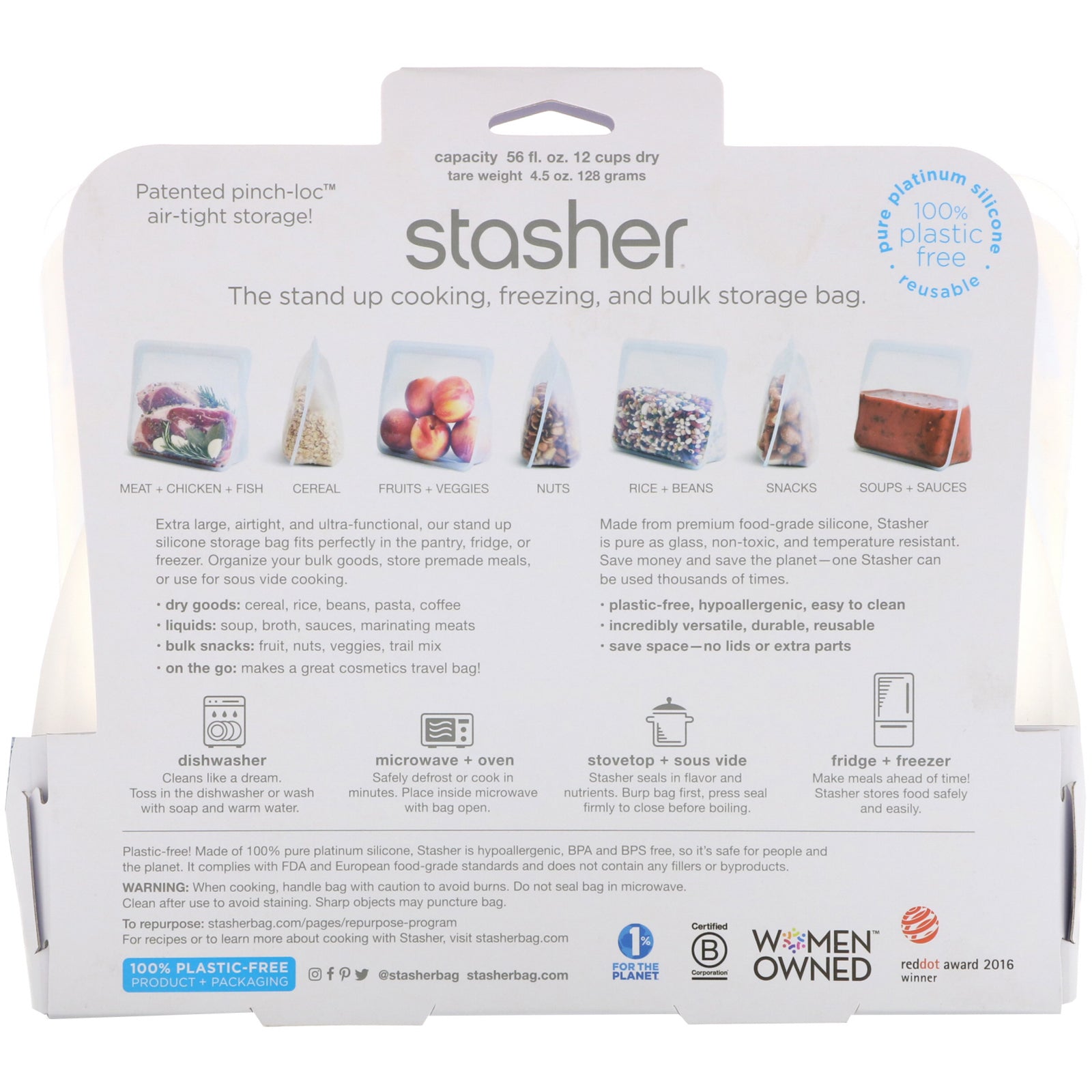 Pure Platinum Silicon Reusable 100% Plastic Free The Plastic-Free Reusable Storage Bag You Can Cook in Certified B Corporation Patented Pinch-Loc Air-Tight Storage! Capacity 56 fl. oz 12 Cups Dry Tare Weight 4.5 oz. 128 Grams Reddot Award 2016 Winner Good For Bulk Dry Storage Store It Freeze It Cook It The stand-up cooking, freezing, and bulking storage bag. Meat + Chicken + Fish Cereal Fruits + Veggies Nuts Rice + Beans Snacks Soups + Sauces Extra-large, airtight, and ultra-functional, our stand up silicon storage bag fits perfectly in the pantry, fridge, or freezer. Organized your bulk goods, store premade meals, or use for sous vide cooking. Dry goods: Cereal, rice, beans, pasta, coffee Liquids: Soup, broth, sauces, marinating meats Bulk snacks: fruit, nuts, veggies, trail mix On the go: Makes a great cosmetics travel bag! Made from premium food-grade silicon, Stasher is pure as glass, non-toxic, and temperature resistant. Save money and save the planet - one Stasher can be used thousands of times. Plastic-free, hypoallergenic, easy to clean Incredibly versatile, durable, reusable Save space - no lids or extra parts Made of 100% pure platinum silicon, stasher is hypoallergenic, BPA and BPS free, so it's safe for people and the planet. It complies with FDA and European food-grade standards and does not contain any fillers or by products.