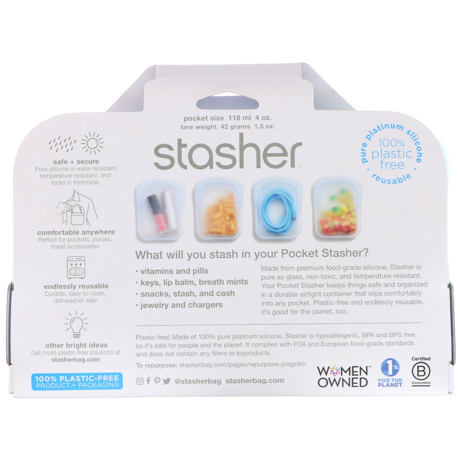 Pure Platinum Silicon Reusable 100% Plastic Free The Perfect Size for The Stuff You Stash Certified B Corporation Pocket Size 118 ml 4 oz. Tare Weight 42 grams 1.5 oz. Safe + Secure Pure silicon is water-resistant, temperature-resistant, and locks in freshness Comfortable anywhere Perfect for pockets, purses, travel accessories. Endlessly Reusable Durable, easy to clean, dishwasher safe. What will you stash in your pocket stasher? Vitamins and Pills Key, lips balm, breath mints Snacks, stash, and cash Jewelry and chargers Made from premium food-grade silicon, stasher is pure as glass, non-toxic, and temperature resistant. Your pocket stasher keeps things safe and organized in a durable airtight container that slips comfortably into any pocket. Plastic-free and endlessly reusable, it's good for the planet, too. Made of 100% pure platinum silicon, stasher is hypoallergenic, BPA and BPS free, so it's safe for people and the planet. It complies with FDA and...