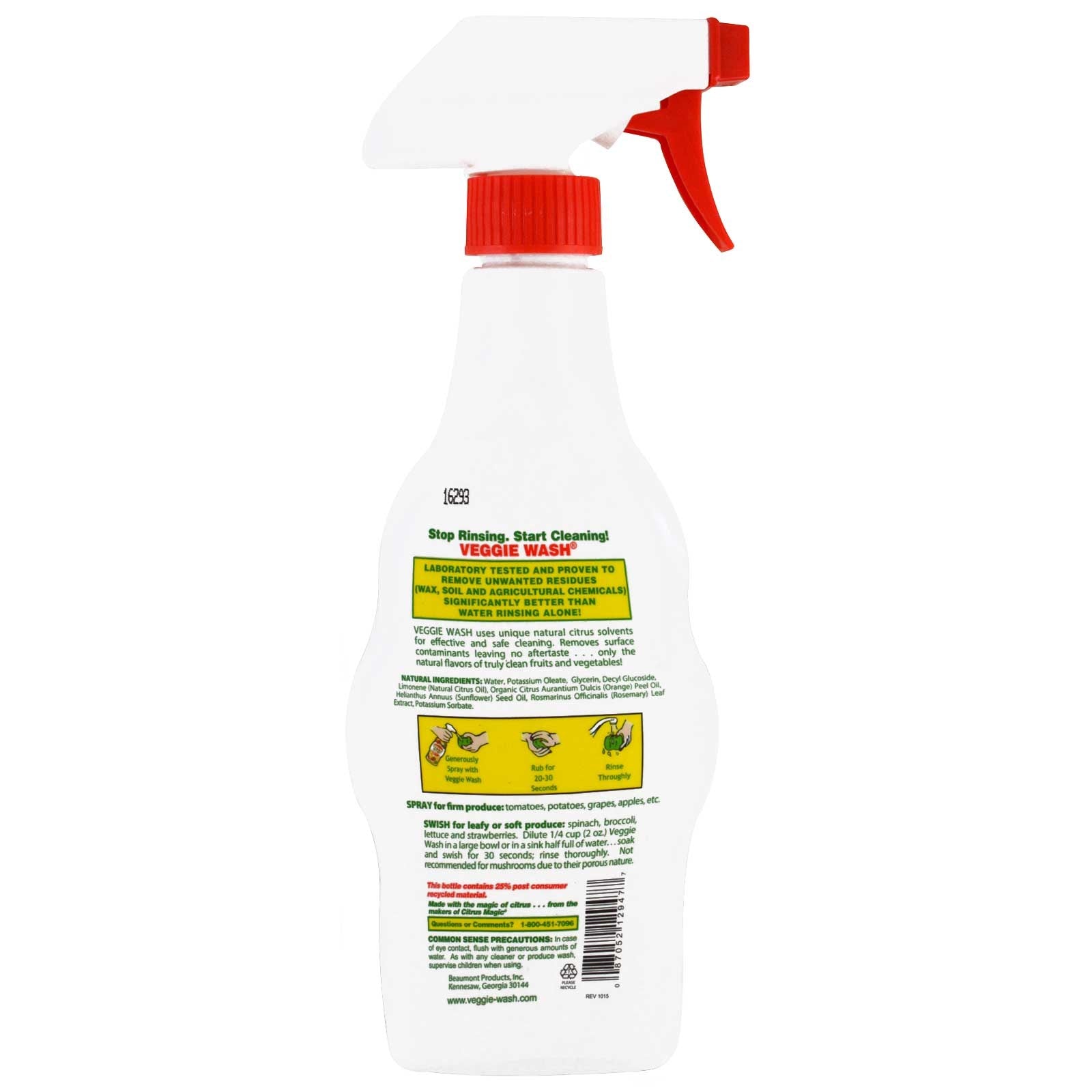 Made with Organic Citrus! Natural Fruit and Vegetable Wash Safer Removal of Waxes, Chemicals and Soil Kosher Stop Rinsing. Start Cleaning! Veggie Wash Laboratory tested and proven to remove unwanted residues (wax, soil and agricultural chemicals) significantly better than water rinsing alone! Veggie Wash uses unique natural organic citrus solvents for effective and safe cleaning. Removes surface contaminants leaving no aftertaste...only the natural flavors of truly clean fruits and vegetables! Made with the magic of citrus...from the makers of Citrus Magic.Sugg. UseGenerously spray with veggie wash. Rub for 20-30 seconds. Rinse thoroughly. Spray for firm produce: tomatoes, potatoes, grapes, apples, etc. Swish for leafy or soft product: spinach, broccoli, lettuce and strawberries. Dilute 1/4 cup (2 oz) Veggie Wash in large bowl or in a sink half full of water. Soak and swish for 30 seconds; rinse thoroughly. Not recommended for mushrooms due to their porous nature.Other IngredientsPurified water, potassium...