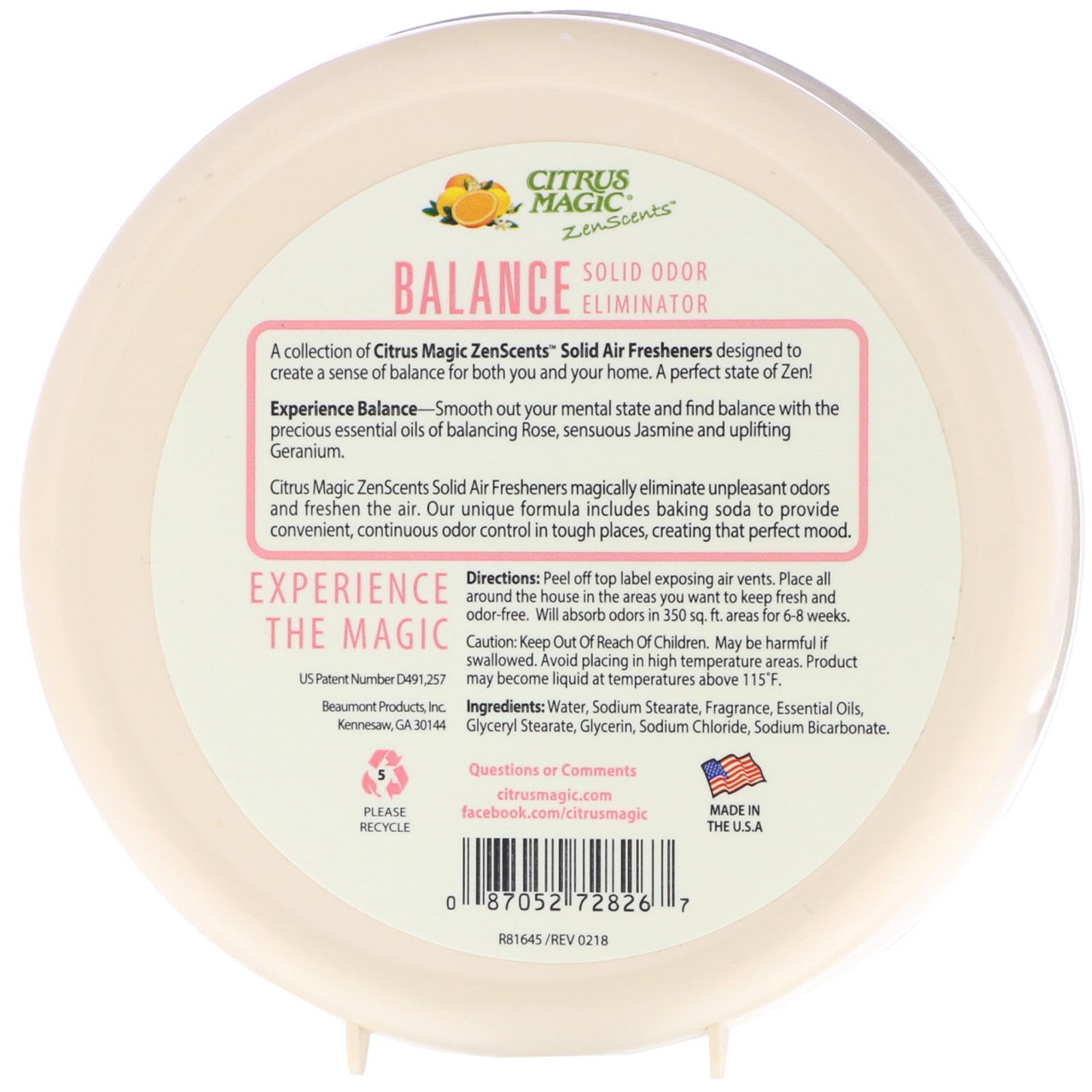 Contains Essential Oils Experience the Magic Solid Odor Eliminator A collection of Citrus Magic ZenScents Solid Air fresheners designed to create a sense of balance for both you and your home. A perfect state of Zen! Experience Balance - Smooth out your mental state and find balance with the precious essential oils of balancing rose, sensuous jasmine and uplifting Geranium. Citrus Magic ZenScents solid Air Fresheners magically eliminate unpleasant odors and freshen the air. Our unique formula includes baking soda to provide convenient, continuous odor control in tough places, creating that perfect mood.Sugg. UsePeel off top label exposing air vents. Place all around the house in the areas you want to keep fresh and odor-free. Will absorb odors in 350 sq. ft, areas for 6-8 weeks.Other IngredientsWater, sodium stearate, fragrance, essential oils, glyceryl stearate, glycerin, sodium chloride, sodium bicarbonate.Supplement FactsDisclaimerWhile VitaminsUK strives to ensure the accuracy of its product images...