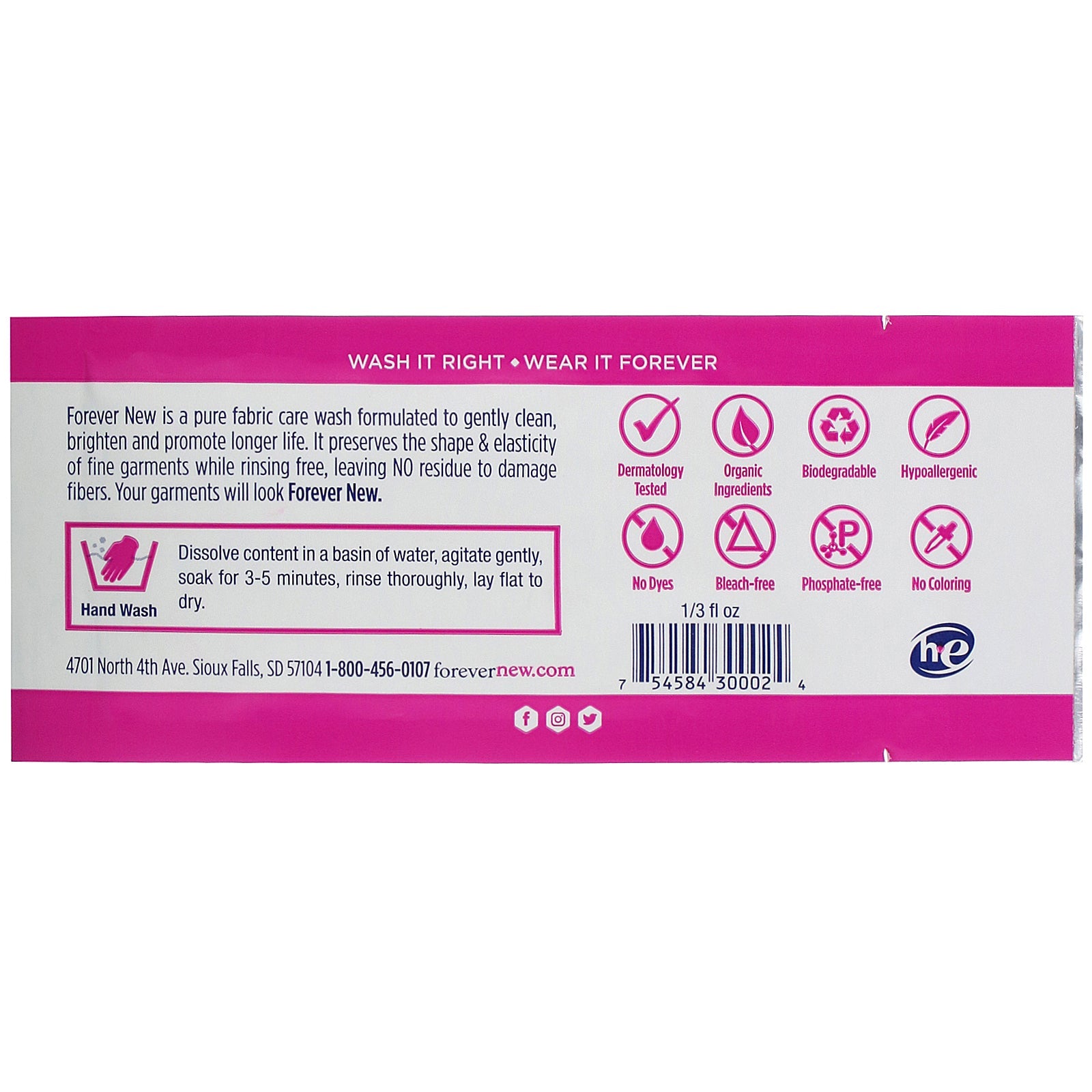 Laundry Care Since 1975 Natural Biodegradable Dye Free Hypoallergenic Wash it Right. Wear it Forever . Dermatology Tested Organic Ingredients Bleach-Free Phosphate Free No Coloring Forever New is a pure fabric care wash formulated to gently clean, brighten and promote longer life. It preserves the shape & elasticity of fine garments while rinsing free, leaving no residue to damage fibers. Your garments will look Forever New.Sugg. UseHand wash - Dissolve content in a basin of water, agitate gently, soak for 3-5 minutes, rinse thoroughly, lay flat to dry.Other IngredientsWater 1-propanaminium, n-(carboxymethyl)-n,n-dimethyl-3-[(1- oxododecyl)amino]-, inner salt poly(oxy-1,2-ethanediyl), .alpha.-sulfo-.omega.-hydroxy-, c10-16-alkyl ethers, sodium salts alcohols, c12-16, ethoxylated proprietary fragrance.Supplement FactsDisclaimerWhile VitaminsUK strives to ensure the accuracy of its product images and information, some manufacturing changes to packaging and/or ingredients may be pending update on our site. Although items may occasionally ship with alternate packaging, freshness is always guaranteed. We recommend that you read labels,...