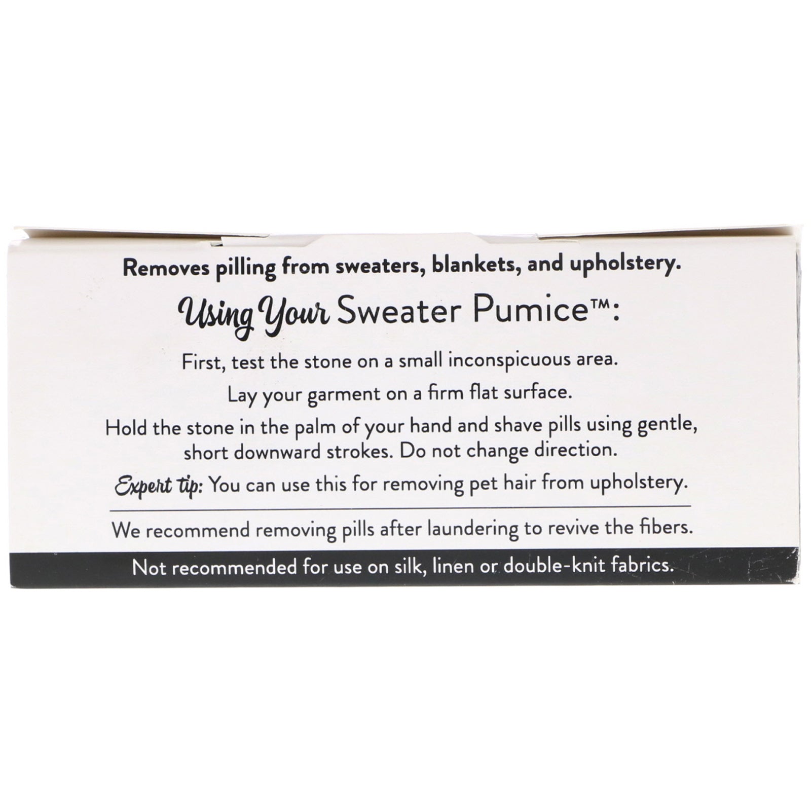 Naturally Removes Pilling Garment Pumice Our company was founded by a nurse and mom in 2008, inspired by the loss of her daughter, Molly. Removes pilling from sweaters, blankets, and upholstery.Sugg. UseUsing your Sweater Pumice: First, test the stone on a small inconspicuous area. Lay your garment on a firm flat surface. Hold the stone in the palm of your hand and shave pills using gentle, short downward strokes. Do not change direction. Expert tip: You can use this for removing pet hair from upholstery. We recommended removing pills after laundering to revive the fibers. Not recommended for use on silk, linen or double-knit fabrics. Made from recycled waste glass, gently shake off any excess pumice after use.Other IngredientsSupplement FactsDisclaimerWhile VitaminsUK strives to ensure the accuracy of its product images and information, some manufacturing changes to packaging and/or ingredients may be pending update on our site. Although items may occasionally...
