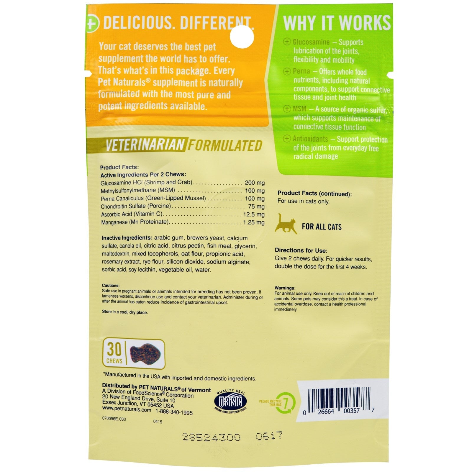 Glucosamine Chondroitin MSM Antioxidants For Cats of All Sizes 6 Healing Ingredients Including All the Health Benefits of the Perna Mussel No Wheat No Corn No Artificial Ingredients Delicious. Different Veterinarian Formulated For Use in Cats Only For all Cats Quality Seal - NASC Your cat deserves the best pet supplement the world has to offer. That's what's in this package. Every Pet Naturals supplement is naturally formulated with the most pure and potent ingredients available. Why It Works Glucosamine - Supports lubrication of the joints, flexibility and mobility Perna - Offers whole food nutrients, including natural components, to support connective tissue and joint health MSM - A source of organic sulfur, which supports maintenance of connective tissue function Antioxidants - Support protection of the joints from everyday free radical damageSugg. UseGive 2 chews daily. For quicker results, double the dose for the first 4 weeks.Other IngredientsSupplement FactsDisclaimerWhile VitaminsUK strives...