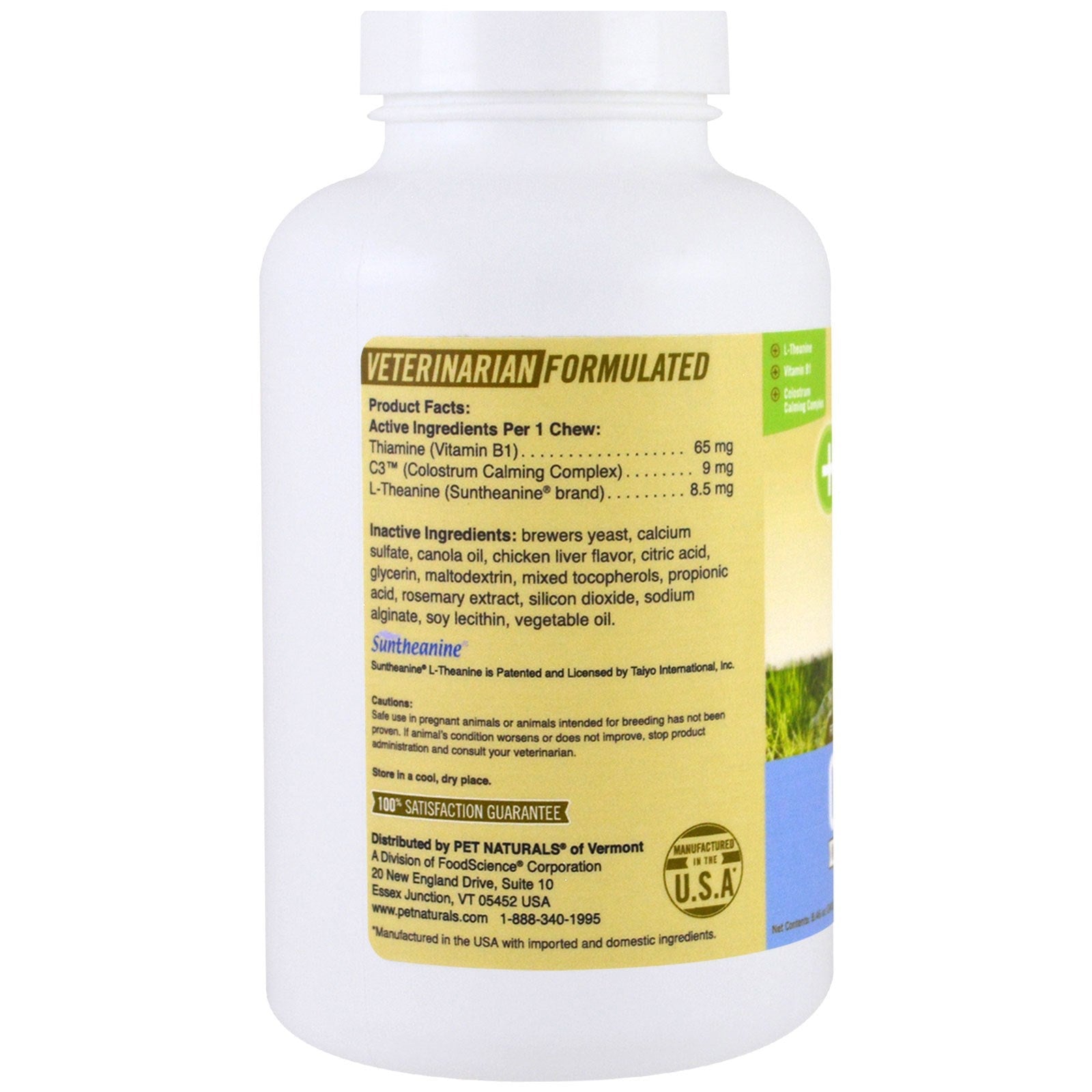 L-Theanine Vitamin B1 Colostrum Calming Complex For Dogs and Cats of All Sizes Works Naturally, Not a Sedative Helps Manage Everyday Stress and Behavioral Issues No Wheat No Corn No Artificial Ingredients** Quality Seal - NASC Why It Works Calming is a daily formula designed for dogs and cats to help manage everyday stress. Our unique blend contains Colostrum Calming Complex, patented L-Theanine and Vitamin B to help promote a calming effect and support balanced behavior. Calming works naturally without causing drowsiness.Sugg. UseFor All Cats Give 1 chew daily. For All Dogs Up to 50 lbs: 1 chew daily Over 50 lbs: 2 chews daily Product can be given daily or as-needed basis. It is safe to double or triple the dose in times of increased stress.Other IngredientsProduct Facts: Active Ingredients Per 1 Chew: Thiamine (Vitamin B1) 65 mg C3 (Colostrum Calming Complex) 9 mg L-Theanine (Suntheanine brand) 8.5 mg...