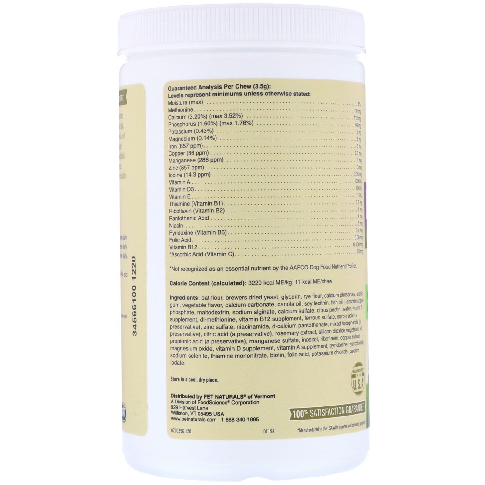 Veterinarian Formulated Complete with 21 Beneficial Nutrients Help Keep Dogs of All Ages in Peak Condition Approx. 150 Chews No Wheat No Corn No Artificial Ingredients** Quality Seal NASC Why It Works Daily Multi is designed to help maintain the overall physical well-being of your dog. Formulated with amino acids, minerals and B vitamins, Daily Multi helps support normal energy levels and healthy metabolic function and provides added nutrients, vitamins and antioxidants often not found in commercial dog foods. **No artificial colors, dyes or harmful preservatives.Sugg. UseFeeding Directions: Under 25 lbs: 1/2 chew daily 25-75 lbs: 1 chew daily Over 75 lbs: 2 chews daily If giving more than 1 chew daily, divide between AM and PM.Other IngredientsOat flower, brewers dried yeast, glycerin, rye flour, calcium phosphate, arabic gum, vegetable flavor, calcium carbonate, canola oil, soy lecithin, fish oil, l-ascorbyl-2-polyhosphate, maltodextrin, sodium alginate, calcium sulfate, citrus pectin, water, vitamin E supplement, dl-methionine, vitamin...
