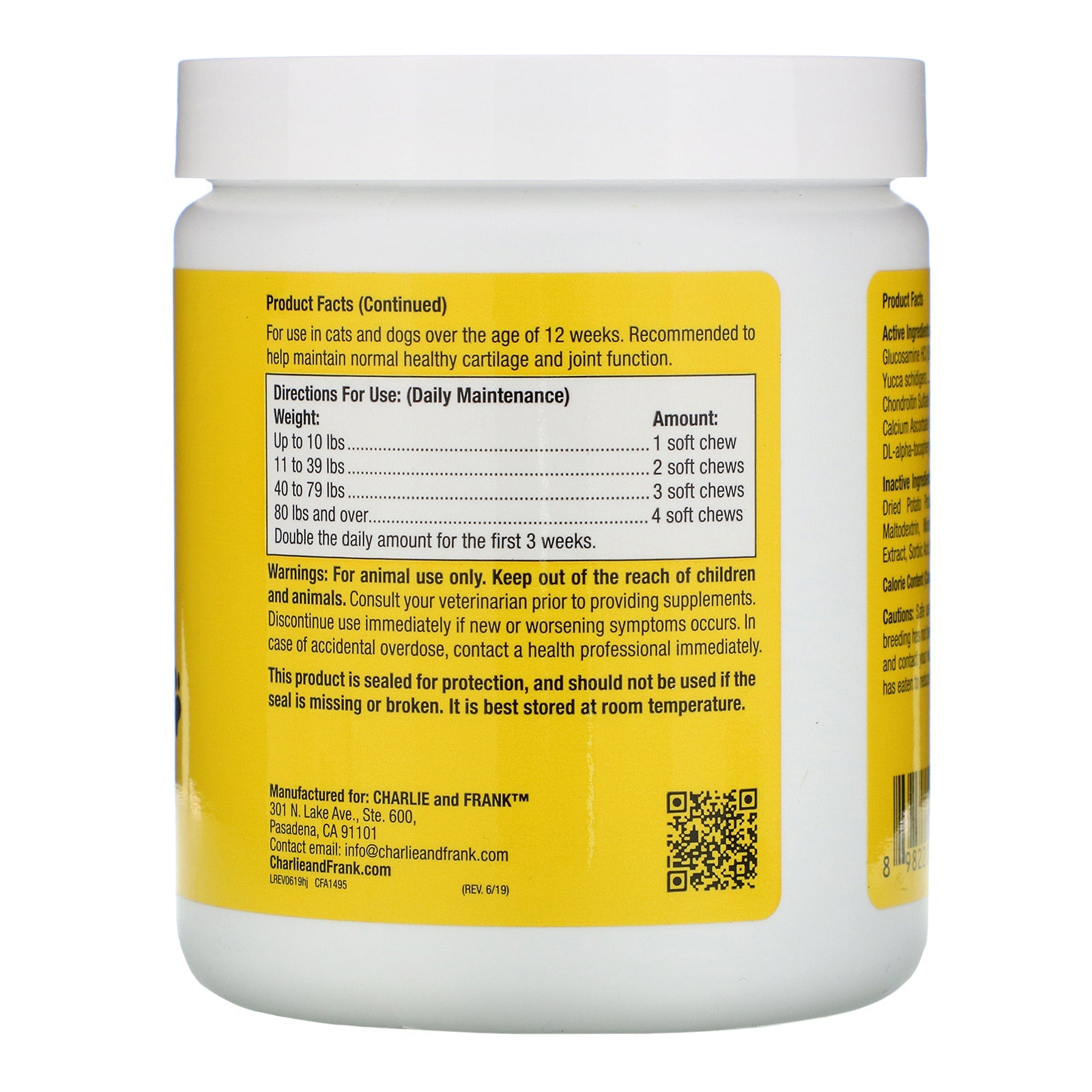 For use in cats and dogs over the age of 12 weeks. Directions For Use: (Daily Maintenance) Weight: Amount: Up to 10 lbs 1 soft chew 11 to 39 lbs 2 soft chews 40 to 79 lbs 3 soft chews 80 lbs & over 4 soft chews Double the daily amount for the first 3 weeks. This product is intended for intermittent or supplemental feeding only.Other Ingredients