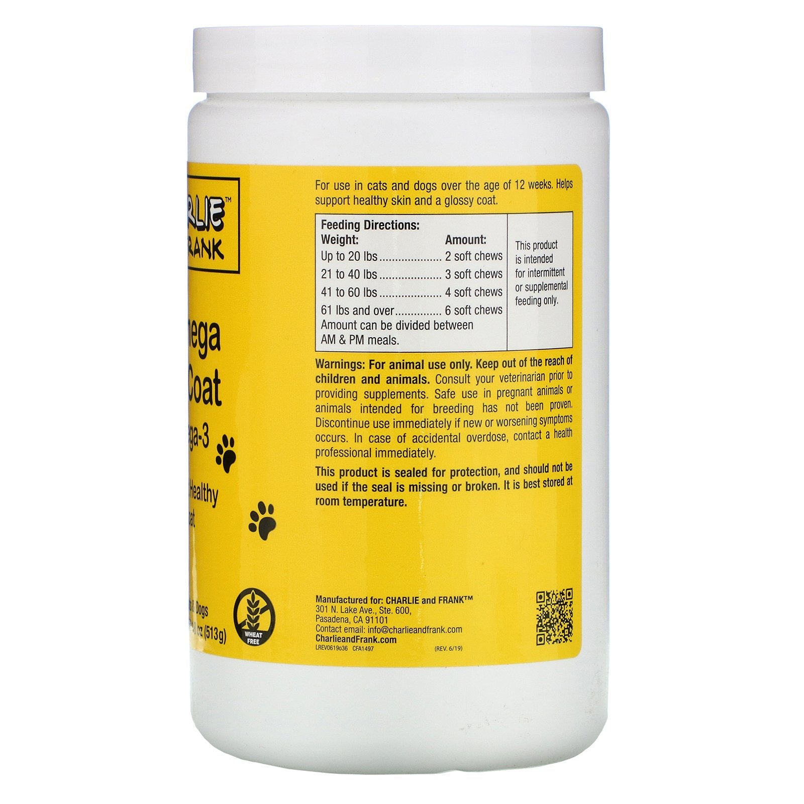 Charlie & Frank Pet Omega Skin & Coat Soft Chew Supplements for Cat & Dogs Helps Support Healthy Skin & Coat Wheat-Free With Omega-3 & Omega-6 Made in the USA in a cGMP Compliant Facility Fun, playful and trusted products for the furriest members of your family. Charlie & Frank Pet Omega Skin & Coat soft chew supplements are formulated to support healthy skin and a glossy coat by combining trustworthy ingredients with tasty brewers yeast, salmon oil, and natural flavors. These chews help your furry family member maintain a healthy snuggle ready coat. Pet Omega Skin & Coat Soft Chews Feature: Linoleic Acid (Omega-6) Alpha-Linolenic Acid (Omega-3) EPA (Eicosapentaenoic Acid) DHA (Docosahexaenoic Acid) iHerb Blog: Cultivating Good Health for You & Your Pet The Benefits of Natural Pet Foods and Products Winter Pet Health TipsSugg. UseFor use in cats and dogs over the age of 12 weeks. Feeding Directions:...