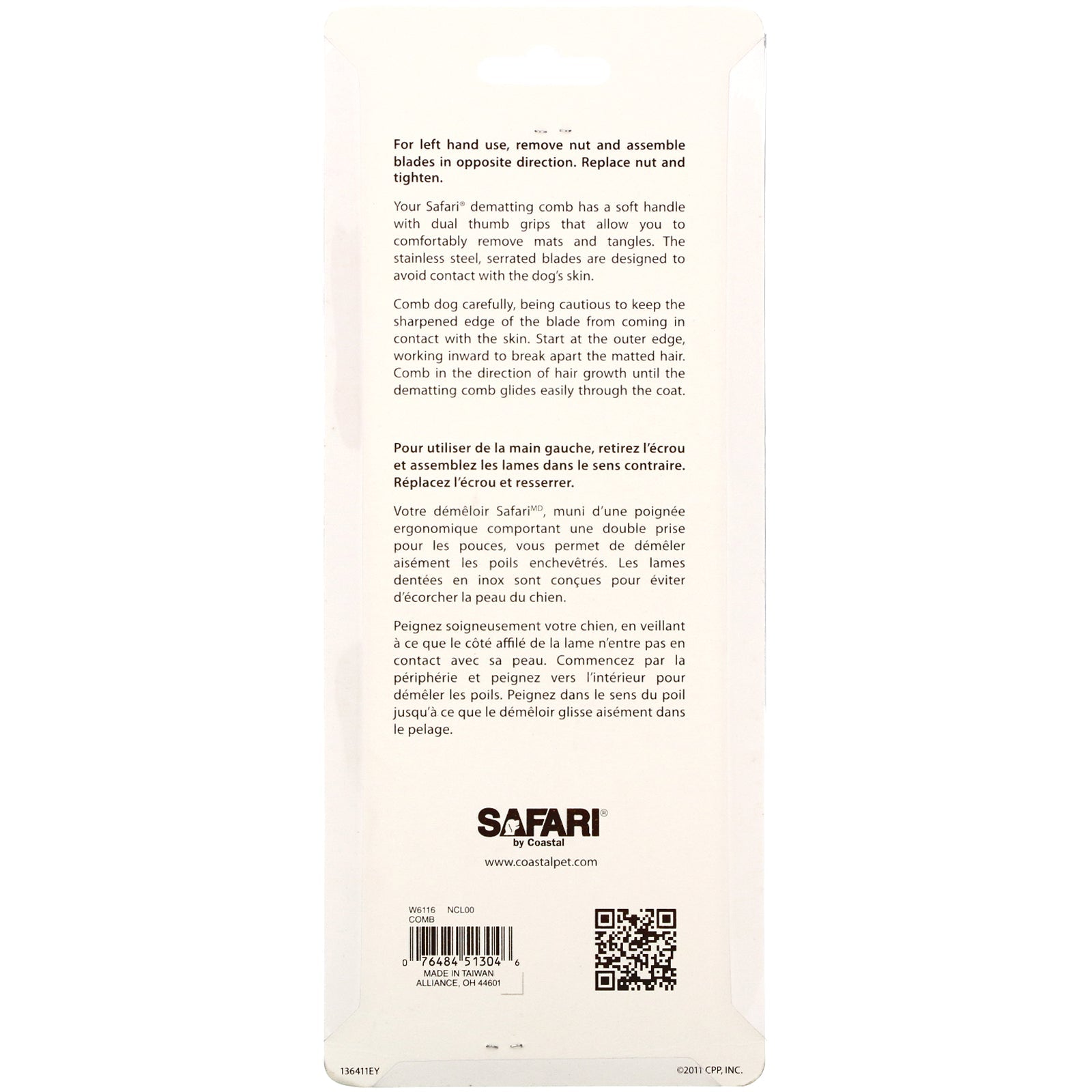 Stainless Steel Left or Right Hand Use Quality Guaranteed Your Safari® dematting comb has a soft handle with dual thumb grips that allow you to comfortably remove mats and tangles. The stainless steel, serrated blades are designed to avoid contact with the dog's skin.Sugg. UseFor left hand use, remove nut and assemble blades in opposite direction. Replace nut and tighten. Comb dog carefully, being cautious to keep the sharpened edge of the blade from coming in contact with the skin. Start at the outer edge, working inward to break apart the matted hair. Comb in the direction of hair growth until the dematting comb glides easily thought the coat.Other IngredientsSupplement FactsDisclaimerWhile VitaminsUK strives to ensure the accuracy of its product images and information, some manufacturing changes to packaging and/or ingredients may be pending update on our site. Although items may occasionally ship with alternate packaging, freshness is always guaranteed. We...