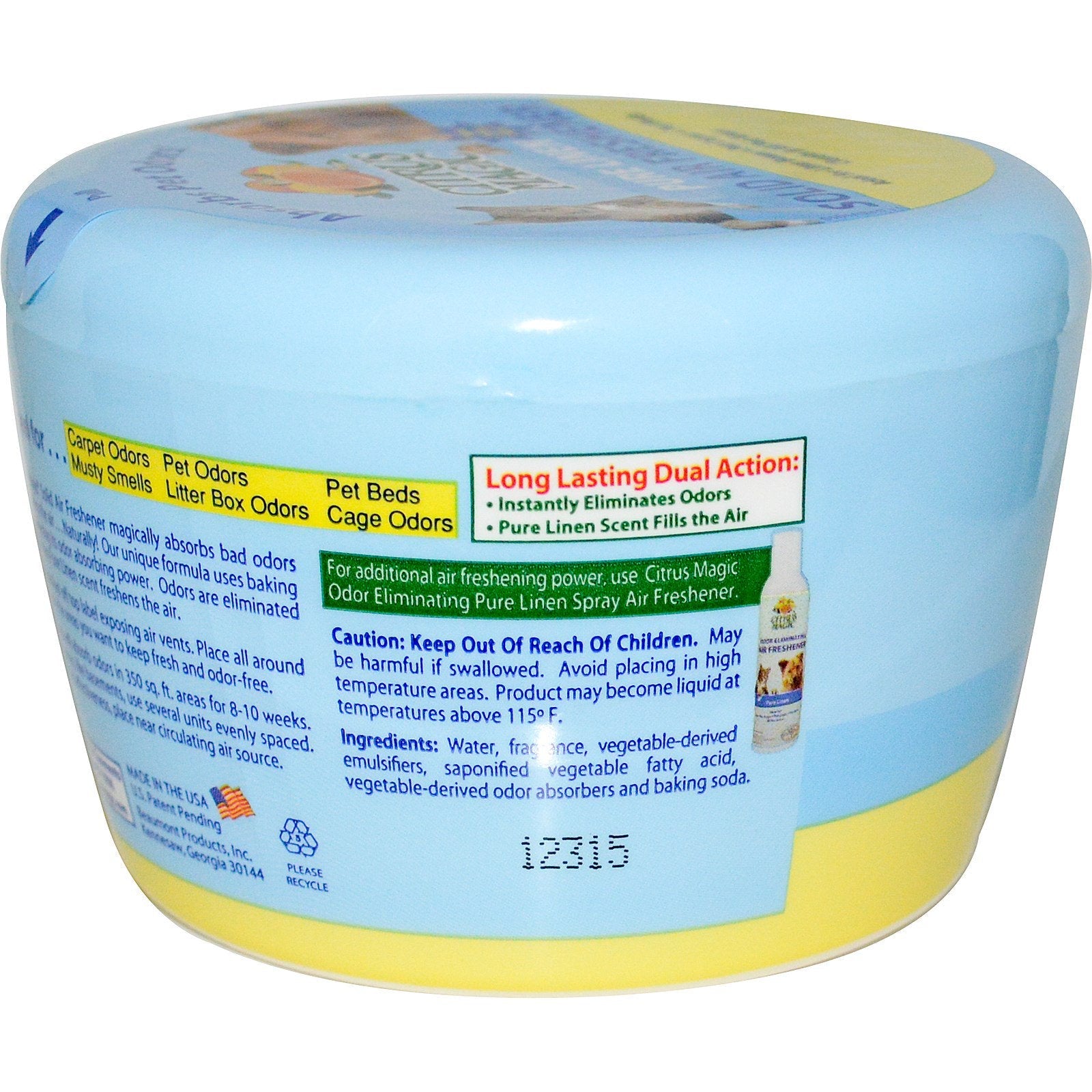 Absorbs Pet Odors! New 20 oz Size! Ideal For Litter Boxes · Pet Cages · Pet Beds · Closets & All Pet Areas Naturally Absorbs Odors! Is ideal for: Carpet Odors Pet Odors Pet Beds Musty Smells Litter Box Odors Cage Odors Long Lasting Dual Action: Instantly Eliminates Odors Pure Linen Scent Fills the Air Citrus Magic Solid Air Freshener magically absorbs bad odors and freshens the air...Naturally! Our unique formula uses baking soda, increasing its odor absorbing power. Odors are eliminated and the clean Pure Linen scent freshens the air.Sugg. UsePeel off top label exposing air vents. Place all around the house in the areas you want to keep fresh and odor-free. Citrus Magic will absorb odors in 350 sq. ft. areas for 8-10 weeks. For larger areas, like basements, use several units evenly spaced. For increased effectiveness, place near circulating air source.Other IngredientsWater, fragrance, vegetable-derived emulsifiers, saponified vegetable...