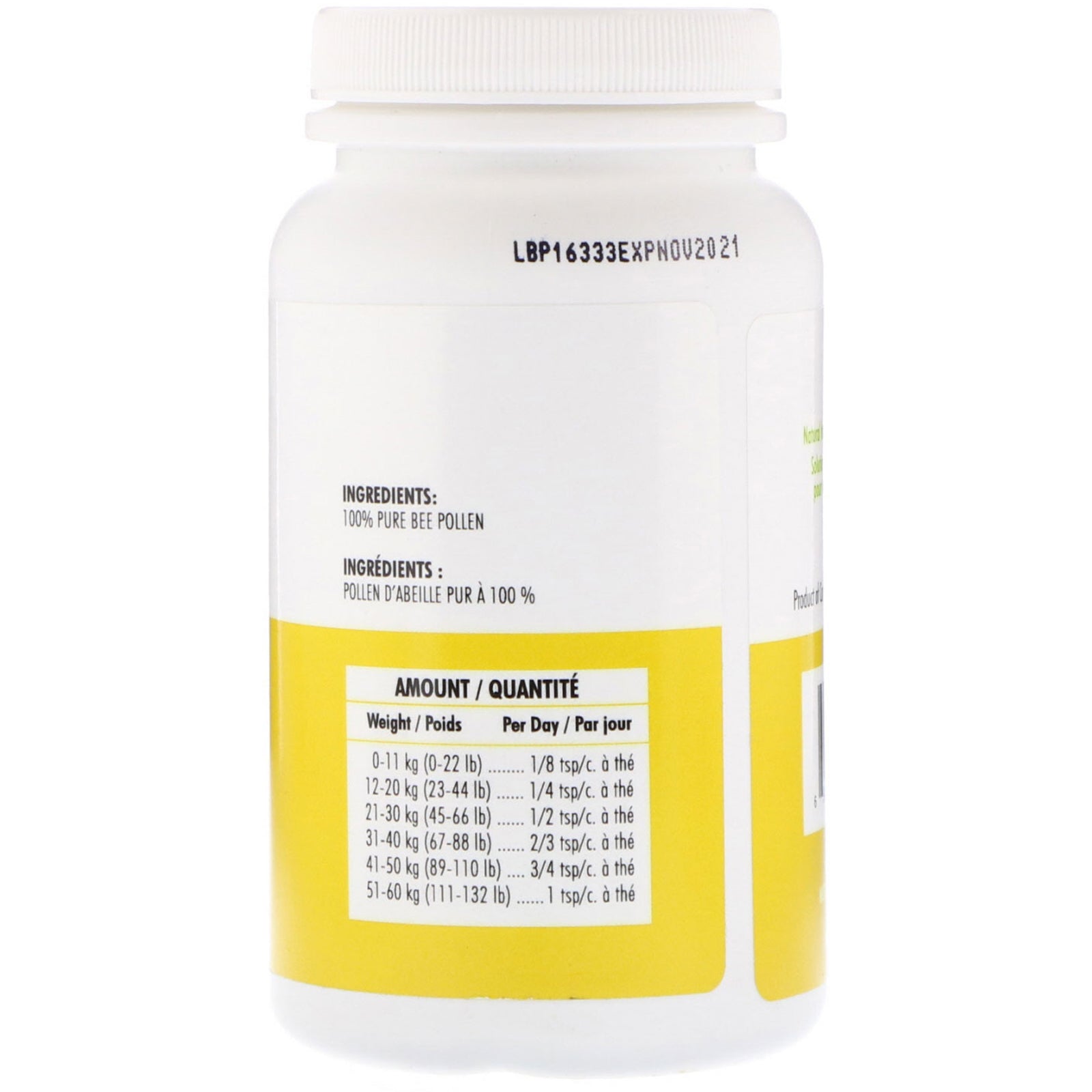 Natural Health Alternatives for PetsSugg. UseAmount Weight / Poids Per Day 0-11 kg (0-22 lb) 1/8 tsp 12-20 kg (23-44 lb) 1/4 tsp 21-30 kg(45-66 lb) 1/2 tsp 31-40 kg (67-88 lb) 2/3 tsp 41-50 kg (89-110 lb) 3/4 tsp 51-60 kg (111-132 lb) 1 tspOther Ingredients100% pure bee pollen.Supplement FactsDisclaimerWhile VitaminsUK strives to ensure the accuracy of its product images and information, some manufacturing changes to packaging and/or ingredients may be pending update on our site. Although items may occasionally ship with alternate packaging, freshness is always guaranteed. We recommend that you read labels, warnings and directions of all products before use and not rely solely on the information provided by VitaminsUK.