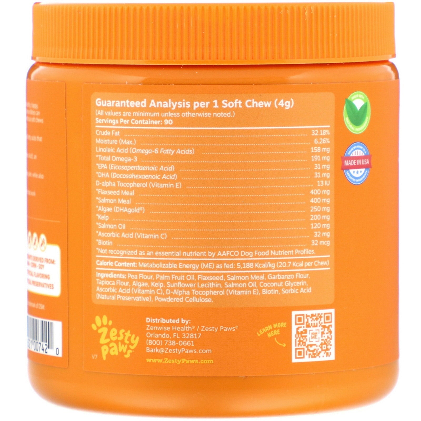 Made with Wild Alaskan Salmon Oil Omega Fatty Acids for Skin & Coat Support 90 Soft Chews* Quality with DHA Gold No Ingredients Derived from: Grain - Corn - Soy No Artificial Flavoring No Artificial Preservatives Made with Natural Ingredients "Sea" the Difference! As a loving dog parent, you take pride in helping your furry friend feel healthy, happy, and waggy. So, if your pup's skin and coat need a little extra TLC, our Salmon Bites can help. Packed with Vitamins, nutrients, and Omega fatty acids, these nutritious soft chews are formulated to keep your dog's skin and coat looking their very best. Wild Alaskan Salmon Oil: Contains nourishing Omega-3 and Omega-6 fatty acids that support the skin and coat for a healthy appearance. DHAgold® : A sustainable algae-derived source of DHA (Docosahexaenoic Acid), an Omega-3 fatty acid that promotes soft skin and shiny coats. Kelp: An iodine and nutrient-rich superfood that supports supple looking skin, while also supporting coat health. Vitamin Complex: A powerful blend of Vitamin C, Vitamin E, and Biotin that work together to promote soft skin and healthy coats. *Product filled by weight