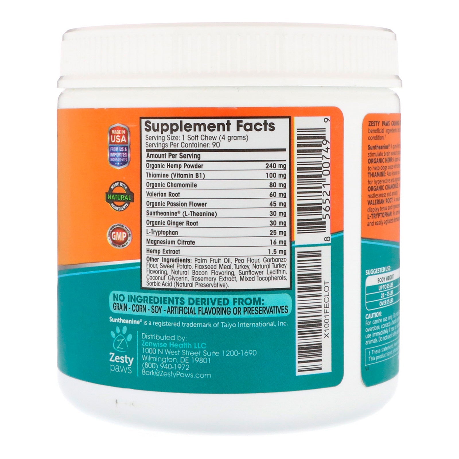 All Ages With Suntheanine Behavior Support Dietary Supplement Made in USA-From US & Imported Ingredients Made with All Natural Ingredients GMP- Good Manufacturing Practice Consistent Quality With Organic Hemp, Chamomile & L-Theanine Promotes Balanced Behavior & Stress Relief Relieves Anxiety, Hyperactivity & Aggression Non-Drowsy Formula Zesty Paws Calming Bites are advanced chewable supplement with beneficial ingredients that can help dogs feel calm and comfortable in any condition. Suntheanine: A pure form of L-Theanine that is specially formulated to safely stimulate brain waves to support stress-free relaxation without drowsiness. Organic Hemp: A plant-based ingredient with properties that have been shown to help dogs cope with external stressors to promote calmness and composure. Thiamine: Also known as Vitamin B1, Thiamine encourages balanced behavior for hyperactive and aggressive dogs. Organic Chamomile: A calming herb that has been shown to help alleviate restlessness and anxiety. Valerian Root: A natural anti-anxiety herb that can help comfort dogs that display tense and hypersensitive behavior. L-Tryptophan: An amino acid that helps to calm dogs with disruptive, anxious, and easily agitated demeanors.