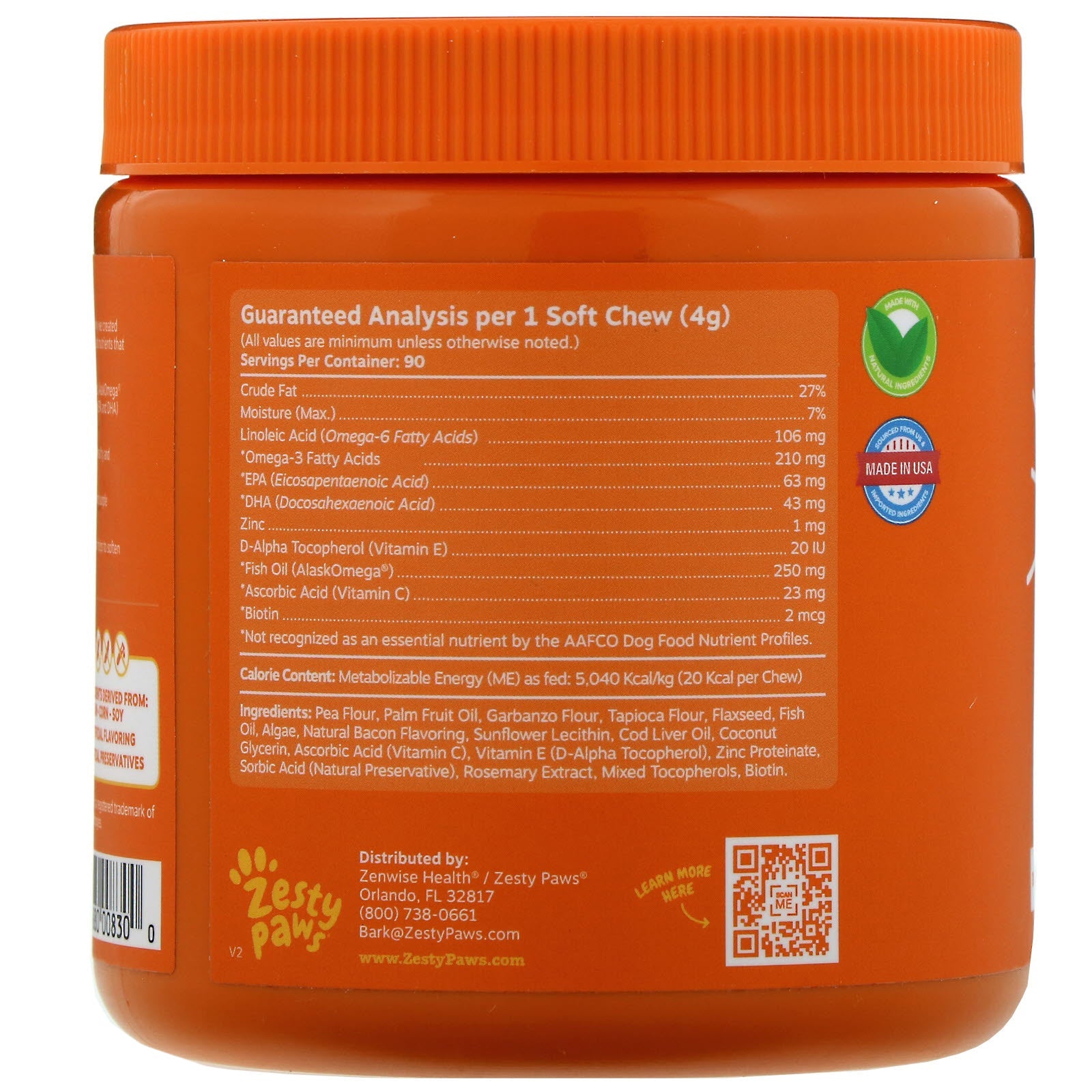 Quality with AlaskOmega® Contains Omega Fatty Acids with EPA & DHA Softens Skin & Nourishes Goats 90 Soft Chews* No Ingredients Derived: Grain - Corn - Soy No Artificial Flavoring No Artificial Preservatives Made with Natural Ingredients Soft Skin + Shiny Coat = Happy Dog! Your furry friend deserves to feel comfortable in their own skin. That's why we created Omega Bites™, a delicious chewable with Omega Fatty acids, vitamins, and nutrients that support skin and coat health. AlaskOmega® Fish Oil : Using traceable and sustainable fishing methods, AlaskOmega® fish oil provides a highly concentrated source of Omega fatty acids (with EPA and DHA) derived from Wild Alaskan Pollock to promote skin and coat health. Vitamin C : Provides powerful antioxidants that may help to give skin a healthy and nourished appearance. Vitamin E : A fat-soluble vitamin with antioxidants that promotes soft and supple looking skin. Biotin : Also known as Vitamin B7, this water-soluble B-Complex vitamin helps to soften the skin and coat. *Product filled by weight