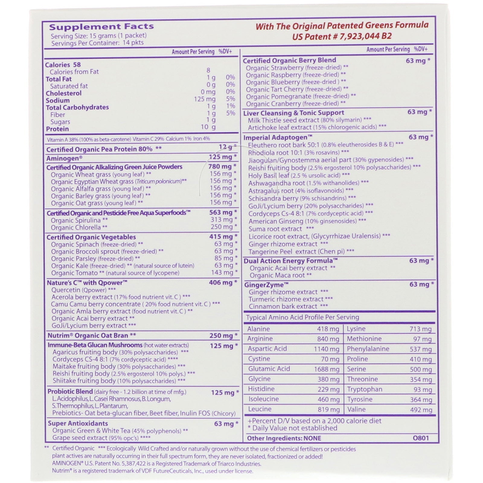 Serving Size: 15 grams (1 Packet) Serving Per Container: 14 pkts Amount Per Serving % DV+ Calories 58 Calories from Fat 8 Total Fat 1 g 0% Saturated Fat 0 g 0% Cholesterol 0 mg 0% Sodium 125 mg 5% Total Carbohydrates 1 g 1% Fiber 1 g 5% Sugars 1 g Protein 10 g Vitamin A 38%(100% as beta-carotene) 38% Vitamin C 29% Calcium 1% Iron 4% Certified Organic Pea Protein 80%** 12 g * Aminogen 125 mg * Certified Organic Alkalizing Green Juice Powders 780 mg * Organic Wheat grass (young leaf) ** 156 mg * Organic Egyptian Wheat grass (Triticum polonicum)** 156 mg * Organic Alfalfa grass (young leaf) ** 156 mg * Organic Barley grass (young leaf) ** 156 mg * Organic Oat grass (young leaf) ** 156 mg * Certified Organic and Pesticide Free Aqua Superfoods 563 mg * Organic Spirulina ** 313 mg * Organic Chlorella ** 250 mg * Certified Organic Vegetables 415 mg * Organic Spinach (freeze-dried)** 63 mg * Organic Broccoli sprout (freeze-dried)** 63 mg * Organic Parsley (freeze-dried)** 85 mg * Organic Kale (freeze-dried) ** (natural source of lutein) 63 mg * Organic Tomato ** (natural source of lycopene) 143 mg * Nature's C with Qpower Quercetin (Qpower)*** Acerola berry extract (17% food nutrient vit. C)*** Camu Camu berry extract (20% food nutrient vit. C)*** Organic Amla berry extract (food nutrient vit. C)** Organic Acai berry extract** GoJi/Lycium berry extract*** 406 mg * Nutrim Organic Oat Bran ** 250 mg * Immune-Beta Glucan Mushrooms (hot water extracts) Agaricus fruiting body (30% polysaccharides)*** Cordyceps CS-4 8:1 (7% cordyceptic acid)**** Maitake fruiting body (30% polysaccharides)*** Reishi fruiting body (2.5% ergosterol 10% polys.)*** Shiitake fruiting body (10% polysaccharides)*** 125 mg * Probiotic Blend (dairy free - 1.2 billion at time of mfg.) L. Acidophilus, L. Casei Rhamnosus, B. Longum, S. Thermophilus. L. Plantarum, Prebiotics - Oat beta-glucan fiber, Beet fiber, Inulin FOS (Chicory) 125 mg * Super Antioxidants Organic Green & White Tea (45% polyphenols)** Grape seed extract (95% opc's)**** 63 mg * Certified Organic Berry Blend Organic Strawberry (freeze-dried)** Organic Raspberry (freeze-dried)** Organic Blueberry (freeze-dried)** Organic Tart Cherry (freeze-dried)** Organic Pomegranate (freeze-dried)** Organic Cranberry (freeze-dried)** 63 mg * Liver Cleansing & Tonic Support Milk Thistle seed extract (80% silymarin)*** Artichoke leaf extract (15% chlorogenic acids)*** 63 mg * Imperial Adaptogen Eleuthero root bark 50:1 (0.8% eleutherosides B & E)*** Rhodiola root 10:1 (3% rosavins)*** Jiaogulan/Gynostemma aerial part (30% gypenosides)*** Reishi fruiting body (2.5% ergosterol 10% polysaccharides)*** Holy Basil leaf (2.5% ursolic acid)*** Ashwagandha root (1.5% withanolides)*** Astragalus root (4% isoflavonoids)*** Schisandra berry (9% schisandrins)*** Go Ji/Lycium berry (20% polysaccharides)*** Cordyceps Cs-4 8:1 (7% cordyceptic acid)*** American Ginseng (10% ginsenosides)*** Suma root extract*** Licorice root extract, (Glycyrrhizae Uralensis) *** Ginger rhizome extract*** Tangerine Peel extract (Chen pi)*** 63 mg * Dual Action Energy Formula Organic Acai berry ** Organic Maca root ** 63 mg * GingerZyme Ginger rhizome extract*** Turmeric rhizome extract*** Cinnamon bark extract*** 63 mg * +Percent D/V based on a 2,000 calorie diet. *Daily Value not established. **Certified Organic. *** Ecologically Wild Crafted and/or naturally grown without the use of chemical fertilizers or pesticides Plant actives are naturally occurring in their full spectrum form, they are never isolated, fractionized or added!Disclaimer