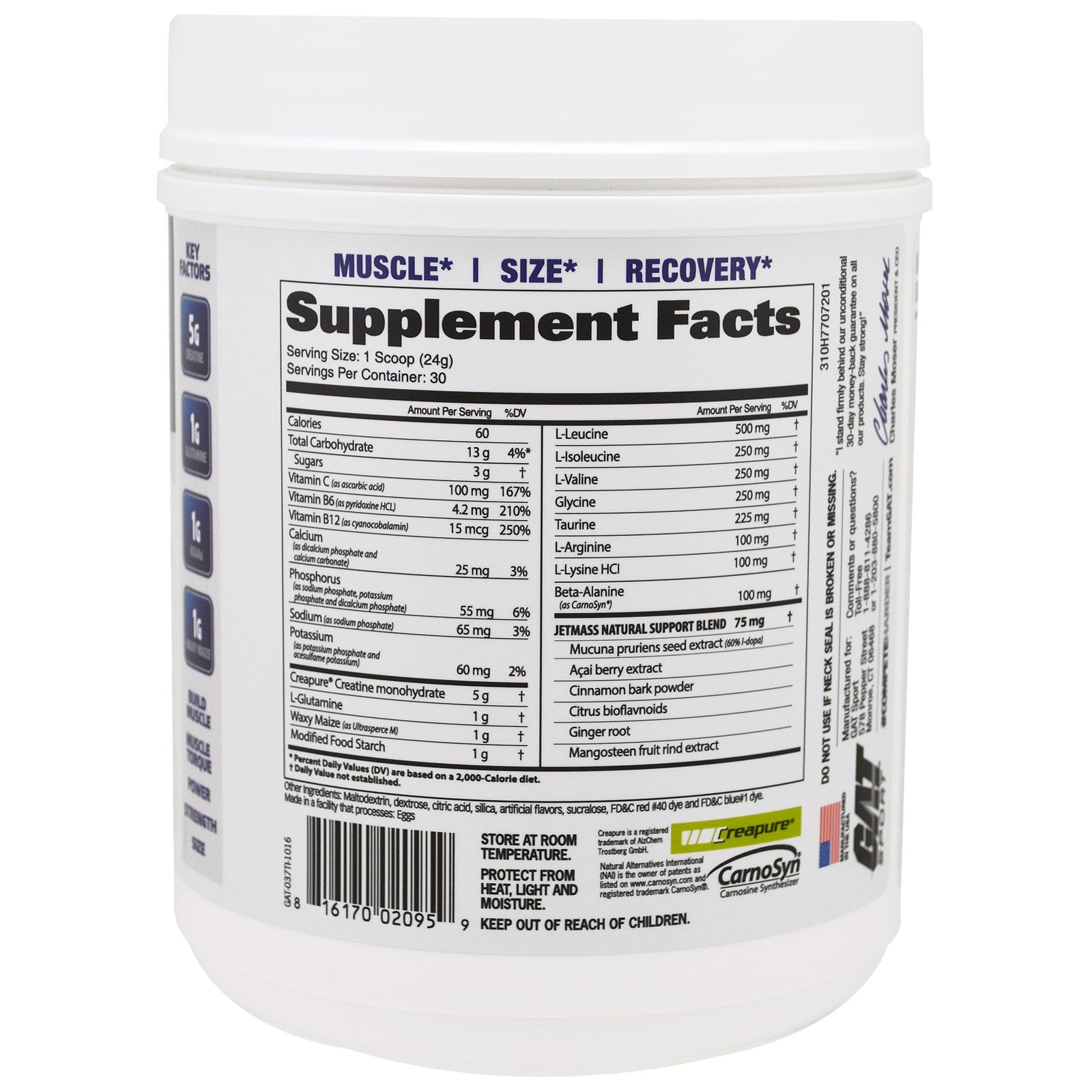Serving Size: 1 Scoop (24 g) Serving Per Container: 30 Amount Per Serving %DV Calories 60 Total Carbohydrate 13 g 4%* Sugars 3 g † Vitamin C (as ascorbic acid) 100 mg 167% Vitamin B6 (as pyridoxine HCl) 4.2 mg 210% Vitamin B12 (as cyanocobalamin) 15 mcg 250% Calcium (as dicalcium phosphate and calcium carbonate) 25 mg 3% Phosphorous (as sodium phosphate, potassium phosphate and dicalcium phosphate) 55 mg 3% Sodium (as sodium phosphate) 65 mg 3% Potassium (as potassium phosphate and acesulfame potassium) 60 mg 2% Creapure Creatine monohydrate 5 g † L-Glutamine 1 g † Waxy Maize (as Ultrasperce M) 1 g † Modified Food Starch 1 g † L-Leucine 500 mg † L-Isoleucine 250 mg † L-Valine 250 mg † Glycine 250 mg † Taurine 225 mg † L-Arginine 100 mg † L-Lysine HCl 100 mg † Beta-Alanine (as CarnoSyn) 100 mg † JetMass Natural Support Blend 75 mg † Mucuna prureins seed extract (60% l-dopa) Acai berry extract Cinnamon bark powder Citrus bioflavnoids Ginger root Mangosteen fruit rind extract * Percent Daily Values (DV) are based on a 2,000-Calorie diet. † Daily Value not established.Disclaimer