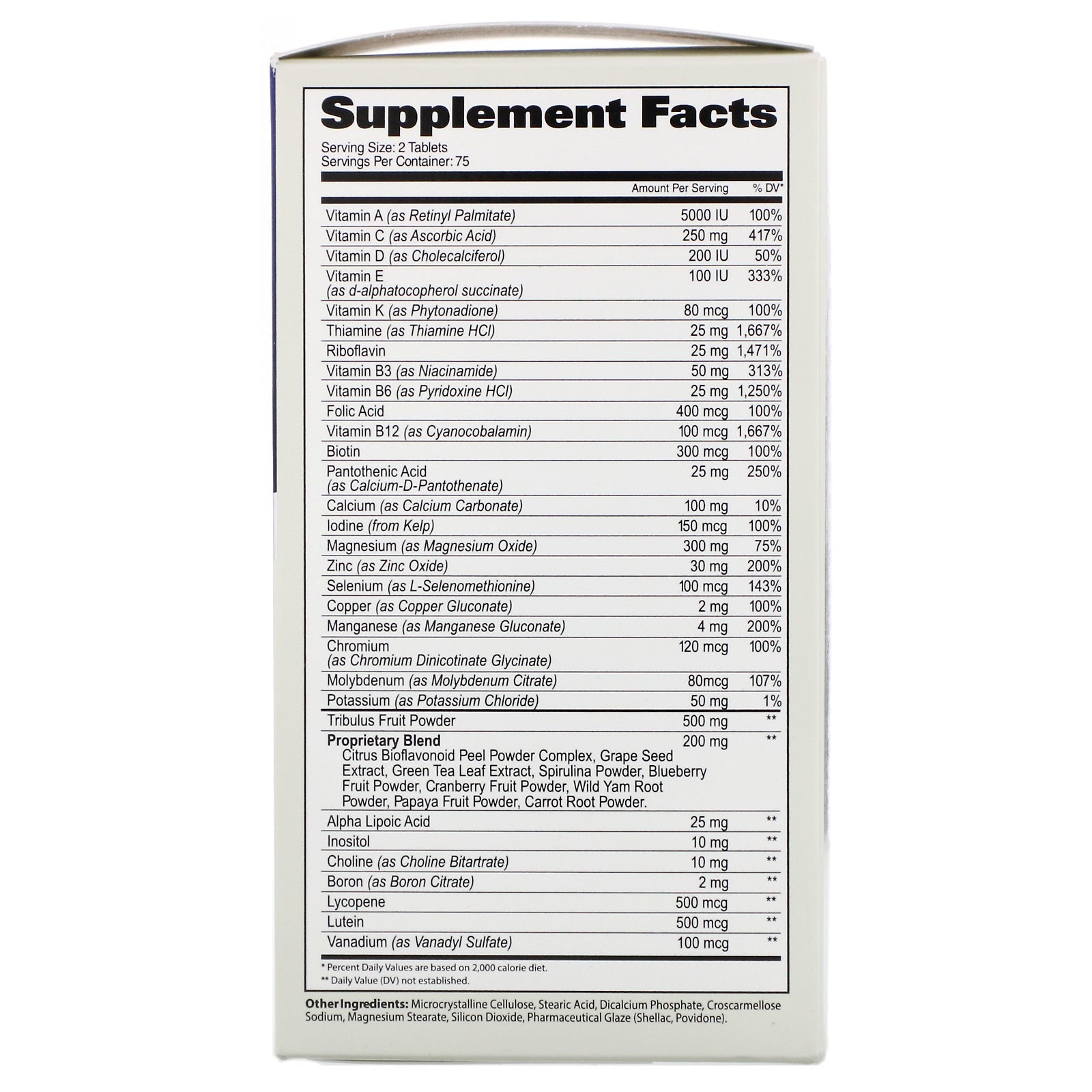 Serving Size: 2 Tablets Servings Per Container: 75 Amount Per Serving: % DV* Vitamin A (as Retinyl Palmitate) 5000 IU 100% Vitamin C (Ascorbic Acid) 250 mg 417% Vitamin D (as Cholecalciferol) 200 IU 50% Vitamin E (as d-alphatocopherol succinate) 100 IU 333% Vitamin K (as Phytonadione) 80 mcg 100% Thiamine (as Thiamine HCl) 25 mg 1,667% Riboflavin 25 mg 1,471% Vitamin B3 (as Niacinamide) 50 mg 313% Vitamin B6 (as Pyridoxine HCl) 25 mg 1,250% Folic Acid 400 mcg 100% Vitamin B12 (as Cyanocobalamin) 100 mcg 1,667% Biotin 300 mcg 100% Pantothenic Acid (as Calcium-D-Pantothenate) 25 mg 250% Calcium (as Calcium Carbonate) 100 mg 10% Iodine (from Kelp) 150 mcg 100% Magnesium (as Magnesium Oxide) 300 mg 75% Zinc (as Zinc Oxide) 30 mg 200% Selenium (as L-Selenomethionine) 100 mcg 143% Copper (as Copper Gluconate) 2 mg 100% Manganese (as Manganese Gluconate) 4 mg 200% Chromium (as Chromium Dinicotinate Glycinate) 120 mcg 100% Molybdenum (as Molybdenum Citrate) 80 mcg 107% Potassium (as Potassium Chloride) 50 mg 1% Tribulus Fruit Powder 500 mg ** Proprietary Blend Citrus Bioflavonoid Peel Powder Complex, Grape Seed Extract, Green Tea Leaf Extract, Spirulina Powder, Blueberry Fruit Flavor, Cranberry Fruit Powder, Wild Yam Root Powder, Papaya Fruit Powder, Carrot Root Powder. 200 mg ** Alpha Lipoic Acid 25 mg ** Inositol 10 mg ** Choline (as Choline Bitartrate) 10 mg ** Boron (as Boron Citrate) 2 mg ** Lycopene 500 mcg ** Lutein 500 mcg ** Vanadium (as Vanadyl Sulfate) 100 mcg ** *Percent Daily Values are based on a 2,000 calorie diet. **Daily Value (DV) not established.Disclaimer