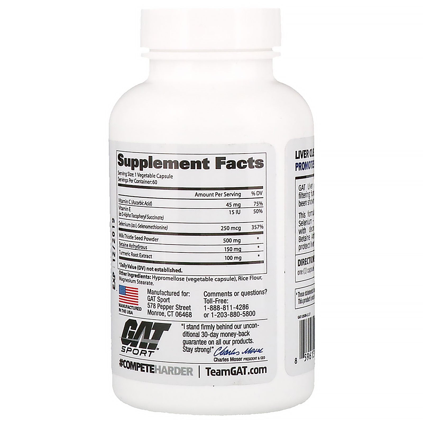 Supports Healthy Liver Function Essentials Detoxify and Purify Supports Health and Performance Satisfaction Guaranteed - GAT Authentic Dietary Supplement Liver Cleanse Promotes Healthy Liver Function GAT Liver Cleanse assist your liver's vital filtering function. Milk Thistle Seed Extract has been shown to protect and promote liver health. This formula also provides Vitamin C, E and Selenium - powerful antioxidants that assist with decreasing oxidative stress. Contains Betaine Anhydrous, a nutrient found to help protect liver cells from toxins.Sugg. UseAs a dietary supplement take one (1) capsule 1 - 3 times daily.Other IngredientsHypromellose (vegetable capsule), rice flour, magnesium stearate.Supplement FactsServing Size: 1 Vegetable Capsule Serving Per Container: 60 Amount Per Serving %Daily Value Vitamin C (Ascorbic Acid) 45 mg 75% Vitamin E (as D-Alpha Tocopheryl Succinate) 15 IU 50% Selenium (as L-Selenomethionine) 250 mcg 357% Milk Thistle Seed Powder 500 mg * Betaine Anhydrous 150 mg * Turmeric Root Extract 100...