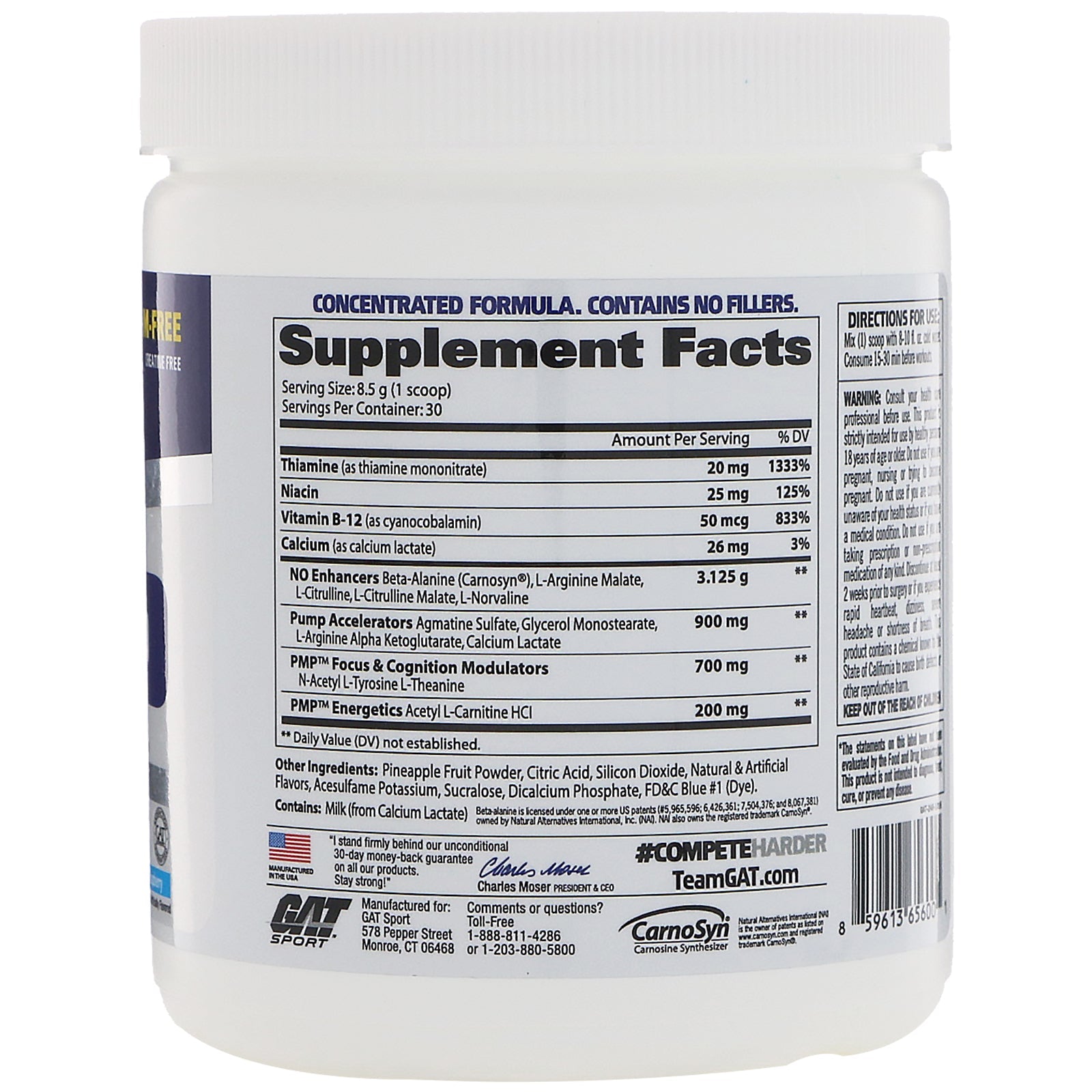 Stim-Free Creatine Free Intense Performance Gains & Mental Focus Muscle Energy & Rapid Vascular Muscle Pumps 30 Servings Dietary Supplement Naturally and Artificially Flavored Concentrated Formula. Contains No Fillers. #CompeteHarder CarnoSyn STM-Free PMP: Peak Muscle Performance PMP Stimulant-Free by GAT delivers the next generation of intense pre-workouts. Take your sports endurance and muscular output to the next level. Experience more massive pumps, laser-focus, and workout intensity. A powerful blend of clinically researched key ingredients formulated to deliver the ultimate in Peak Muscle Performance. Multi-Wave Delivery Wave 1: You will feel PMP's strong, muscle activating action, it ignites a high intensity workout and delivers critical performance nutrients to your muscles. Wave 2: Increased concentration and razor sharp focus will hit you, helping your mind and body work in tandem for perfect execution of each and every action of your workout. Wave 3: As your workout intensifies, your muscles will expand from increased blood volume and you will feel skin tightening effects that keep your body fired up even after your workout ends. Experience explosive energy and improved performance. Exercise Intensity: Citrulline, Citrulline Malate and Beta Alanine (CarnoSyn) push your training to the max. The key compounds in PMP have been clinically researched for their benefits to athletic performance via increased blood flow, enhanced nutrient delivery, and improved muscular energy and endurance. Cognitive Enhancers: Clinically studied compounds N-Acetyl-Tyrosine and L-Theanine help you remain alert, intense, and mentally focused while you're going from set to set during your workout. Pump Drivers: Clinically studied, vasodilating compounds Agmatine Sulfate, Glycerol Monostearate, and Calcium Lactate.