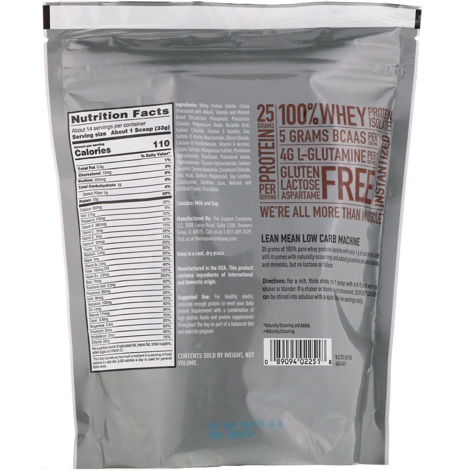 About 14 Servings Added Vitamin & Mineral Blend Naturally and Artificially Flavored With 25 Grams of Protein From 100% Whey Protein Isolate 25 Grams Protein Per Serving 100% Whey Protein Isolate 5 Grams BCAA's Per Serving^ 4 g L-Glutamine Per Serving* Gluten Free - Lactose Free - Aspartame Free Instantized We're All More Than Muscle Lean Mean Low Carb Machine 25 grams of 100% pure whey protein isolate with only 1 g of carb in sight. And still it comes with naturally occurring and added glutamine and added vitamins and minerals, but no lactose or fillers. *Naturally occurring and added. ^Naturally occurring.