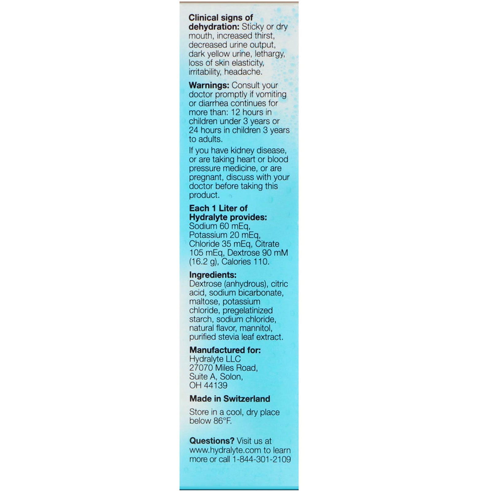With Other Natural Flavor Rapidly replaces fluid and electrolytes for the prevention and relief of dehydration caused by: Vomiting and diarrhea, fever and heavy sweating. Clinical signs of dehydration: Sticky or dry mouth, increased thirst, decreased urine output, dark yellow urine, lethargy, loss of skin elasticity, irritability, headache. Each 1 Liter of Hydralyte provides: Sodium 60 mEq, Potassium 20 mEq, Chloride 35 mEq, Citrate 105 mEq, Dextrose 90 mM (16.2 g), Calories 110.