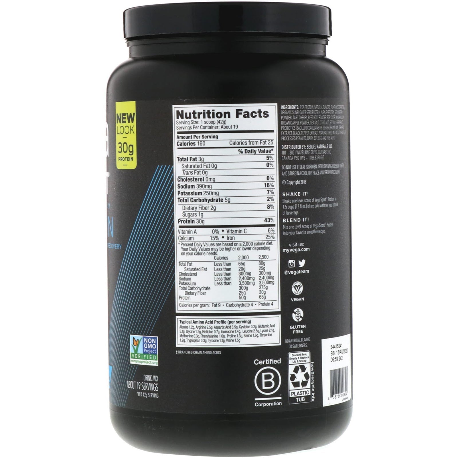 Plant-Based Non GMO Project Verified Drink Mix About 19 Servings Informed Choice.org Trusted by Sport No Added Sugars** Tart Cherry Protein* 30g 5 g BCAAs*‡ 2B CFU Probiotics Helps Build Muscle & Supports Recovery Certified Vegan Gluten Free Certified B Corporation No Artificial Flavors or Sweeteners Made with Real Plant-Based Food Ingredients Post Workout Next Level Performance Calls for Next Level Protein 30g of plant-based protein from a multisource blend of pea, alfalfa, pumpkin seed, and sunflower seed to help build muscle Includes 5 g of BCAAs to help repair muscle Tart cherry to help support recovery 2 Billion CFU probiotics Vega Sport Nutrition System Fuel your better with Vega's three-stage performance nutrition system - pre, mid, and post workout. Brendan Brazier: Vega co-founder and original formulator. former professional Ironman triathlete, and bestselling author. "Vega grew from my goal: to make plant-based nutrition easier for busy people. Since 2004, Vega has brought real, plant-based food ingredients together to help you get the nutrition your body wants, without compromise." **Not a low calorie food *Per 42 g serving ‡Branched chain amino acids