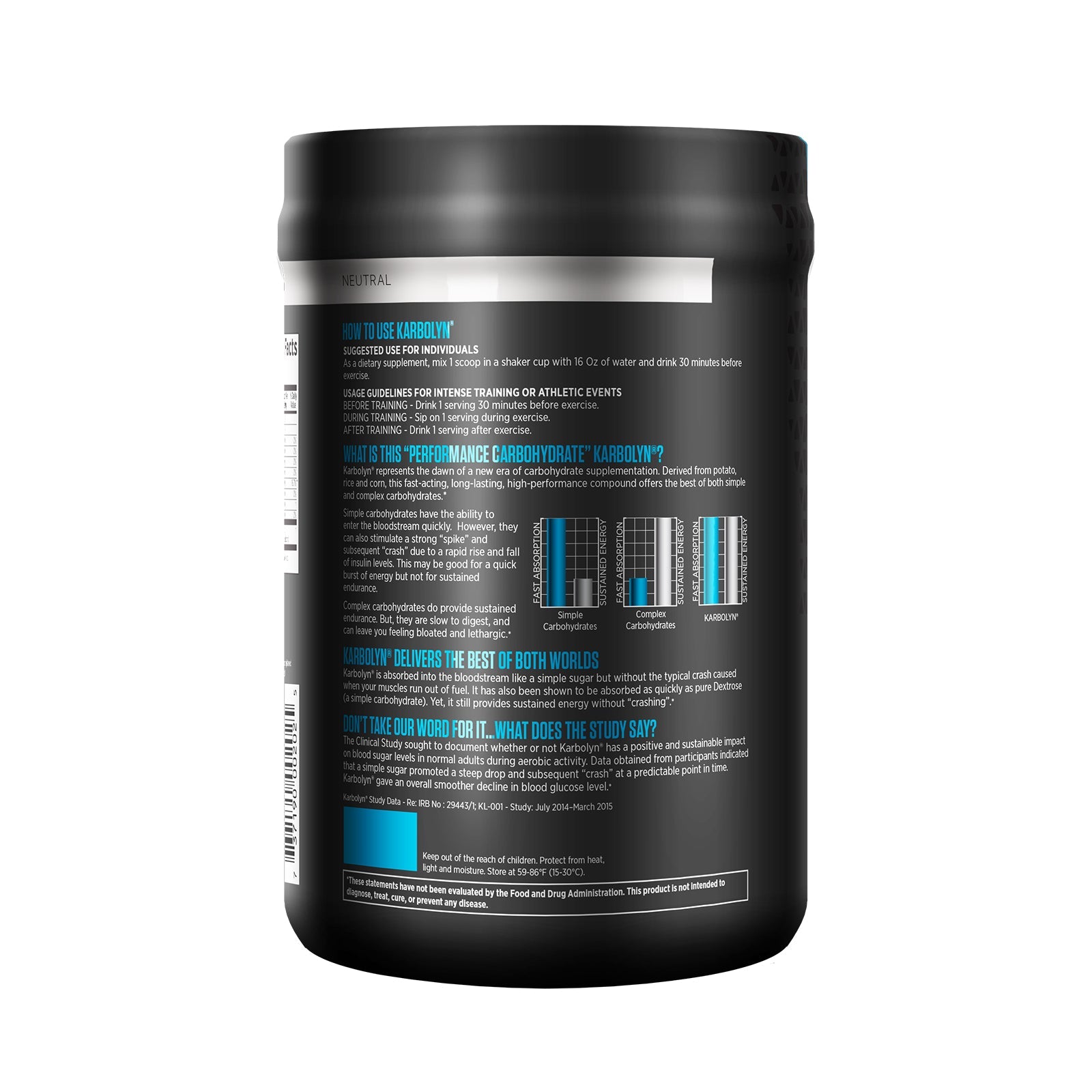 Serving Size: 50 g (One Scoop) Servings Per Container: 20 Amount Per Serving % Daily Value* Calories 200 Calories from Fat 0 Total Fat 0g 0% Saturated Fat 0 g 0% Cholesterol 0 mg 0% Sodium 0 mg 0% Total Carbohydrates 50 g 16.7%** Dietary Fiber 0 g 0% Sugars 0 g † Protein 0 g 0% Karbolyn (homopolysaccaride derived from potato, rice and corn) 50 g † **Percent Daily Values are based on a 2,000 calorie diet. †Daily Value not established.Disclaimer