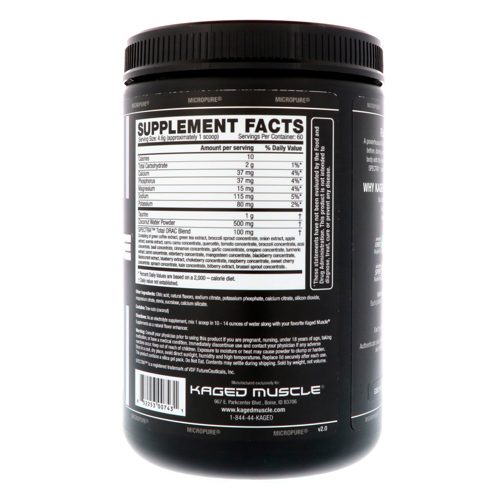 Serving Size: 4.6 g (approximately 1 scoop) Serving Per Container: 60 Amount Per Serving %Daily Value Calories 10 Total Carbohydrate 2 g 1%* Calcium 37 mg 4%* Phosphorus 37 mg 4%* Magnesium 15 mg 4%* Sodium 115 mg 5%* Potassium 80 mg 2%* Taurine 1 g † Coconut Water Powder 500 mg † Spectra Total Orac Blend Consisting of green coffee extract, green tea extract, broccoli sprout concentrate, onion extract, apple extract, acerola extract, camu camu concentrate, quercetin, tomato concentrate, broccoli concentrate, acai concentrate, basil concentrate, cinnamon concentrate, garlic concentrate, oregano concentrate, turmeric extract, carrot concentrate, elderberry concentrate, mangosteen concentrate, blackberry concentrate, blackcurrant extract, blueberry extract, chokeberry concentrate, raspberry concentrate, sweet cherry concentrate, kale concentrate, bilberry extract, brussel sprout concentrate.. 100 mg † *Percent Daily Value are based on a 2,000 - calorie diet. †Daily value not established.Disclaimer