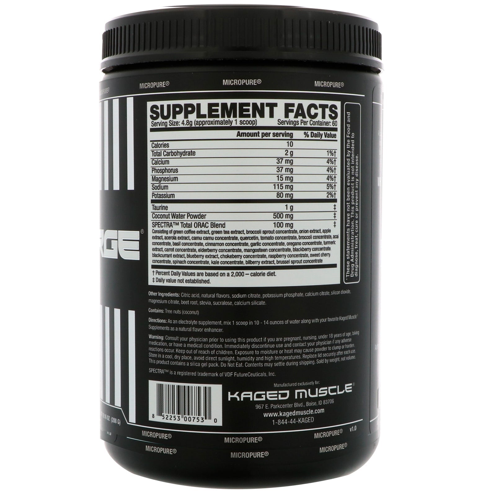 Serving Size: 4.8 g (approximately 1 scoop) Servings Per Container: 60 Amount Per Serving %Daily Value Calories 10 Total Carbohydrate 2 g 1%† Calcium 37 mg 4%† Phosphorus 37 mg 4%† Magnesium 15 mg 4%† Sodium 115 mg 5%† Potassium 80 mg 2%† Taurine 1 g ‡ Coconut Water Powder 500 mg ‡ SPECTRA Total ORAC Blend Consisting of green coffee extract, green tea extract, broccoli sprout concentrate, onion extract, apple extract, acerola extract, camu camu concentrate, quercetin, tomato concentrate, broccoli concentrate, acai concentrate, basil concentrate, cinnamon concentrate, garlic concentrate, oregano concentrate, turmeric extract, carrot concentrate, elderberry concentrate, mangosteen concentrate, blackberry concentrate, blackcurrant extract, blueberry extract, chokeberry concentrate, raspberry concentrate, sweet cherry concentrate, spinach concentrate, kale concentrate, bilberry extract, brussel sprout concentrate 100 mg ‡ † Percent Daily Values are based on a 2,000 - calorie diet. ‡ Daily value not established.Disclaimer