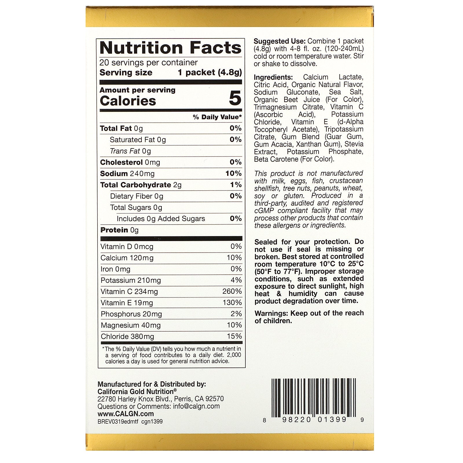 Calcium Lactate, Citric Acid, Organic Natural Flavor, Sodium Gluconate, Sea Salt, Organic Beet Juice (For Color), Trimagnesium Citrate, Vitamin C (Ascorbic Acid), Potassium Chloride, Vitamin E (d-Alpha Tocopheryl Acetate), Tripotassium Citrate, Gum Blend (Guar Gum, Gum Acacia, Xanthan Gum), Stevia Extract, Potassium Phosphate, Beta Carotene (For Color). This product is not manufactured with milk, eggs, fish, crustacean shellfish, tree nuts, peanuts, wheat, soy or gluten. Produced in a third-party, audited and registered cGMP compliant facility that may process other products that contain these allergens or ingredients.Supplement Facts