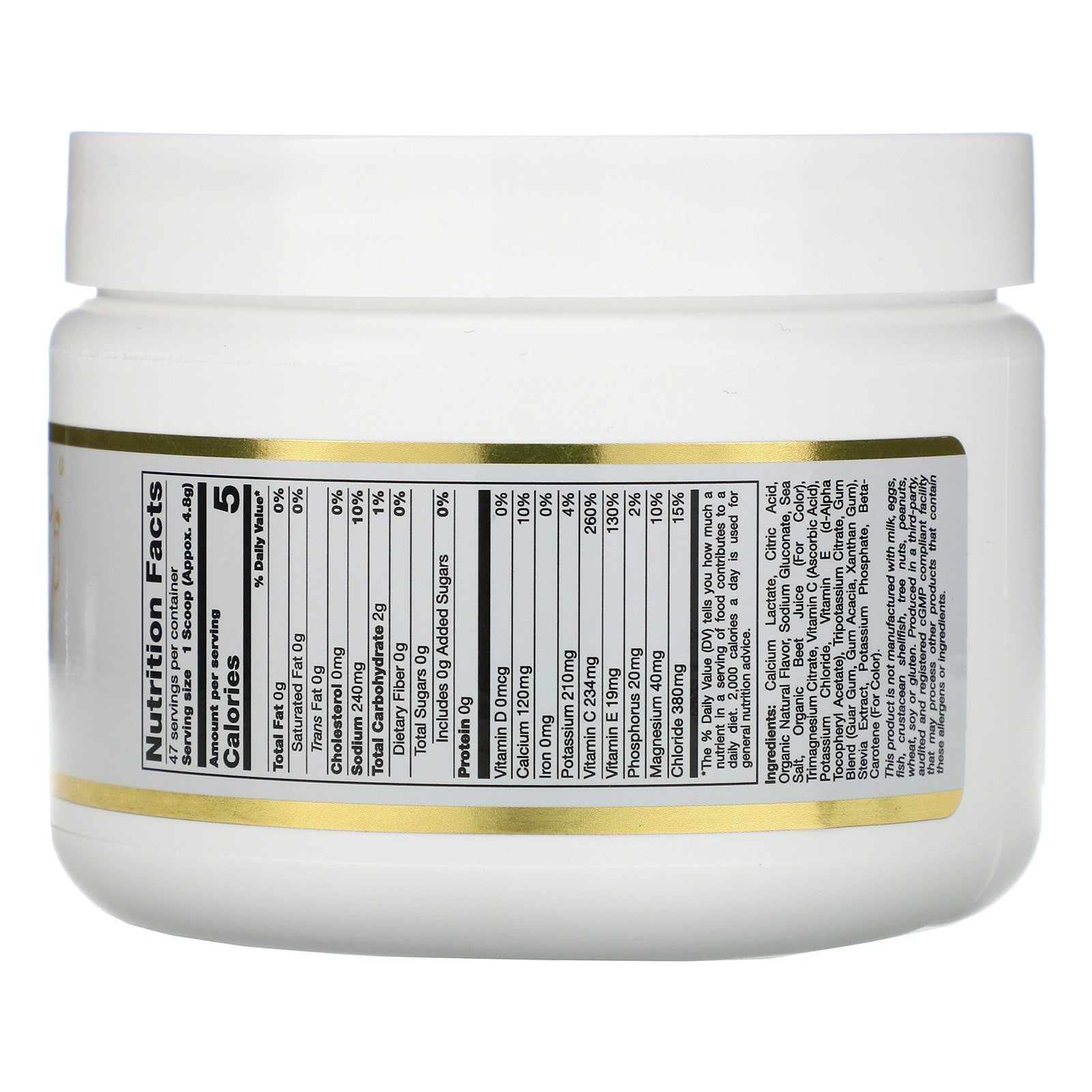 Serving Size: 1 Scoop (Approx. 4.8 g) Serving Per Container: 47 Amount Per Serving %Daily Value* Calories 5 Total Fat 0 g 0% Saturated Fat 0 g 0% Trans Fat 0 g Cholesterol 0 mg 0% Sodium 240 mg 10% Total Carbohydrate 2 g 1% Dietary Fiber 0 g 0% Total Sugars 0 g Includes 0 g Added Sugars 0% Protein 0 g Vitamin D 0 mcg 0% Calcium 120 mg 10% Iron 0 mg 0% Potassium 210 mg 4% Vitamin C 234 mg 260% Vitamin E 19 mg 130% Phosphorus 20 mg 2% Magnesium 40 mg 10% Chloride 380 mg 15% †The % Daily Value (DV) tells you how much a nutrient in a serving of food contributes to a daily diet. 2,000 calories a day is used for general nutrition advice.Disclaimer