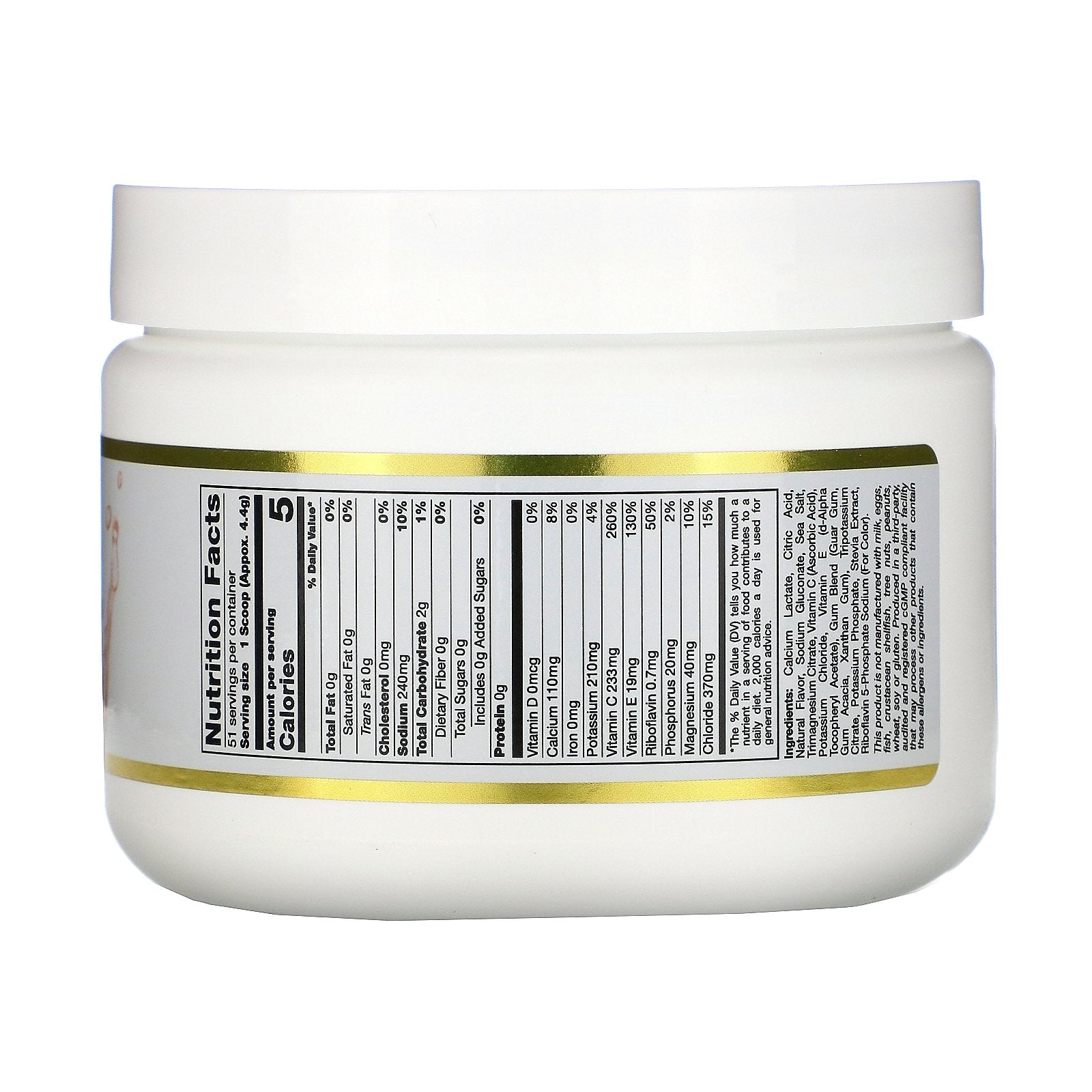 Serving Size: 1 Scoop (Approx. 4.4 g) Serving Per Container: 51 Amount Per Serving %Daily Value* Calories 5 Total Fat 0 g 0% Saturated Fat 0 g 0% Tran Fat 0 g Cholesterol 0 mg 0% Sodium 240 mg 10% Total Carbohydrate 2 g 1% Dietary Fiber 0 g 0% Total Sugars 0 g Includes 0 g Added Sugars 0% Protein 0 g Vitamin D 0 mcg 0% Calcium 110 mg 8% Iron 0 mg 0% Potassium 210 mg 4% Vitamin C 233 mg 260% Vitamin E 19 mg 130% Riboflavin 0.7 mg 50% Phosphorus 20 mg 2% Magnesium 40 mg 10% Chloride 370 mg 15% *The % Daily Value (DV) tells you how much a nutrient in a serving of food contributes to a daily diet. 2,000 calories a day is used for general nutrition advice.Disclaimer