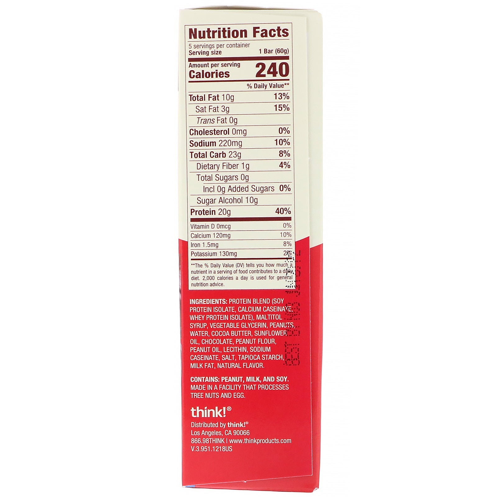20 g Protein 0 g Sugar Per Bar - Not a Low Calorie Food No Artificial Sweeteners♦ GMO Free* Low GI Certified Gluten-Free by GFCO GI Labs Tested Kosher Dairy Each think!® bar blends delicious, crave-worthy flavors with the hunger-fighting protein punch you need to accomplish your goals. Every bite of this Chunky Peanut Butter protein bar is chock-full of wholesome roasted peanuts covered in delicious chocolate. So, whether you are on the go, need a snack halfway up the trail, or crave a pick-me-up before your workout, grab a think!® bar. I think! I can™. *All ingredients have been produced without genetic engineering. ♦Does not contain sucralose, saccharin, aspartame, acesulfame potassium, neotame, or advantame.Sugg. UseOther IngredientsProtein blend (soy protein isolate, calcium caseinate, whey protein isolate), maltitol syrup, vegetable glycerin, peanuts, water, cocoa butter, sunflower oil, chocolate, peanut flour, peanut oil, lecithin, sodium caseinate, salt, tapioca starch, milk fat, natural...