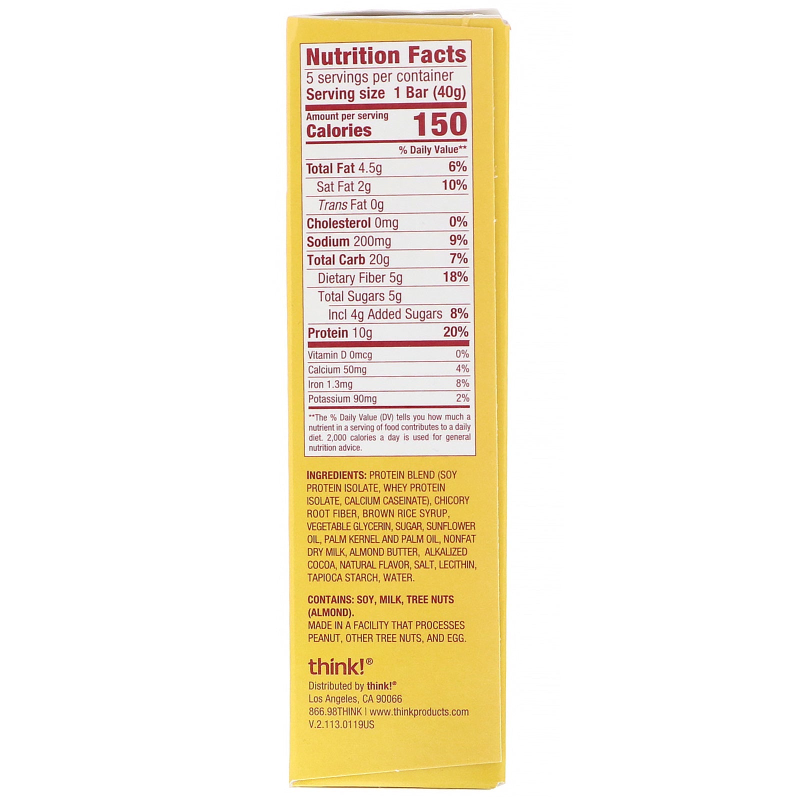 10 g Protein 5 g Fiber - 4.5 g of Fat Per Bar 5 g Sugar Per Bar Naturally Flavored | Chocolatey Dipped Low GI GMO Free* No Artificial Sweeteners^ Certified Gluten Free GI Labs Tested Kosher Dairy So we were thinking, why shouldn't you be able to get a nutritious and delicious snack to help keep you full and satisfied? That's why every think!® Protein+ 150 Calorie Bar has the perfect balance of protein and fiber with no more than 5 g of sugar in decadent flavors like Salted Caramel. Filled with the smooth flavor of caramel with a hint of salt, this bar is a delicious way to keep you going through your day. I think! I can™. *All ingredients have been produced without genetic engineering. ^Does not contain sucralose, saccharin, aspartame, acesulfame potassium, neotame, or advantame.