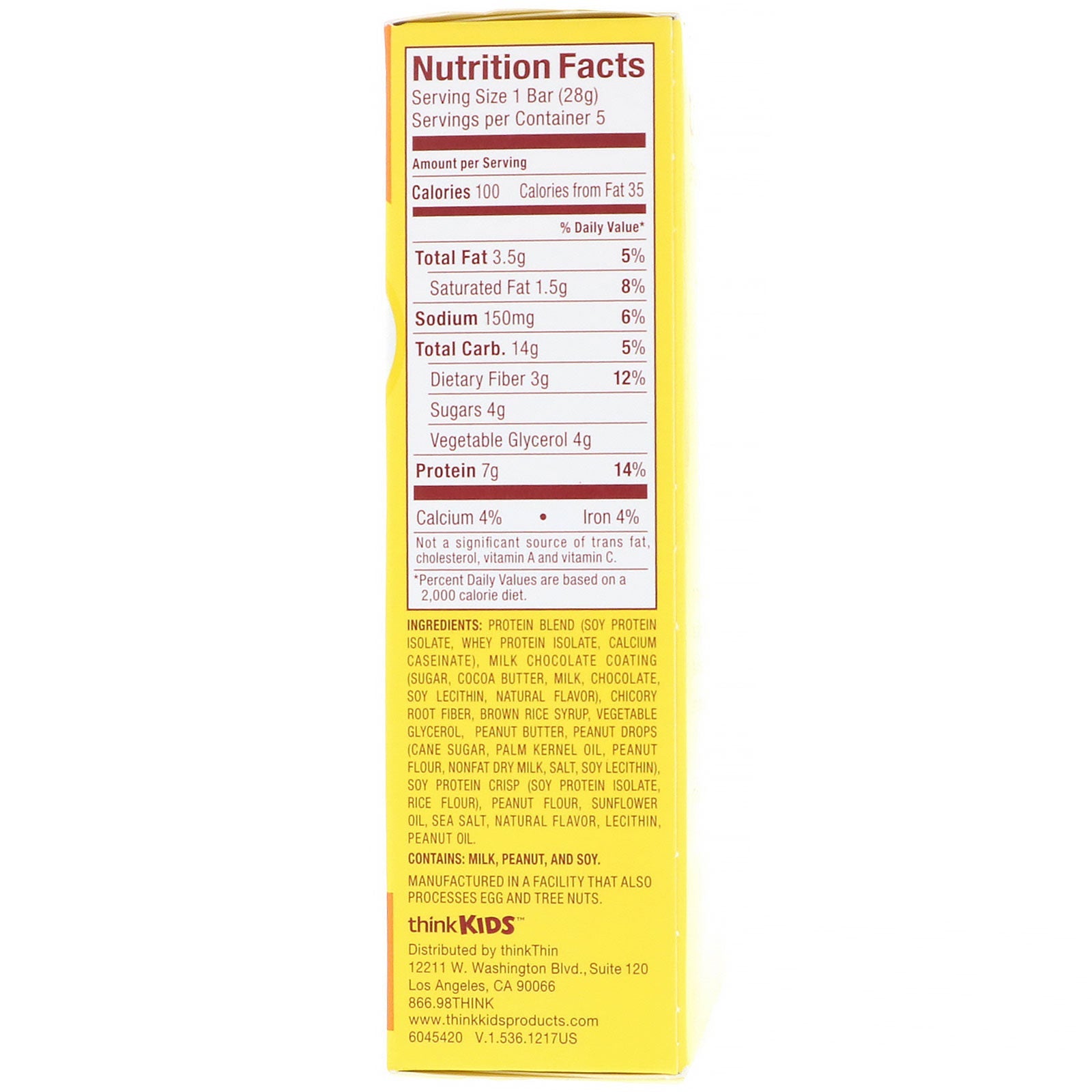 7 g Protein | 3 g Fiber | 4 g Sugar Per Serving No Artificial Flavors or Colors GMO Free† No High Fructose Corn Syrup Certified Gluten Free Kosher In my kitchen, my kids love to get involved and create delicious recipes with me. New thinkKIDS® protein bars are inspired by their favorite flavors. These bars are nutritious, full of protein and fiber, and made with absolutely no artificial flavors or colors. Have a think, Lizanne - Founder & Mom †All ingredients have been produced without genetic engineering.Sugg. UseOther IngredientsProtein blend (soy protein isolate, whey protein isolate, calcium caseinate), milk chocolate coating (sugar, cocoa butter, milk, chocolate, soy lecithin, natural flavor), chicory root fiber, brown rice syrup, vegetable glycerol, peanut butter, peanut drops (cane sugar, palm kernel oil, peanut flour, nonfat dry milk, salt, soy lecithin), soy protein crisp (soy protein isolate, rice flour), peanut flour, sunflower oil, sea salt,...