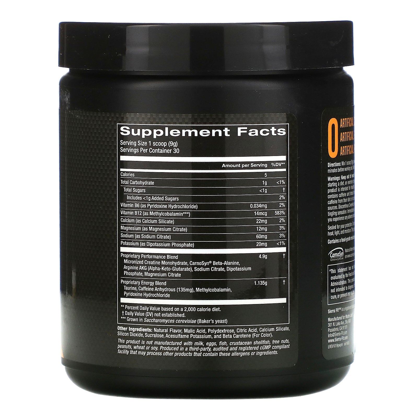 Serving Size: 1 scoop (9 g) Serving Per Container: 30 Amount Per Serving %Daily Value** Calories 5 Total Carbohydrate 1 g <1% Total Sugars <1 g † Includes <1 g Added Sugars 2% Vitamin B6 (as Pyridoxine Hydrochloride) 0.034 mg 2% Vitamin B12 (as Methylcobalamin***) 14 mcg 583% Calcium (as Calcium Silicate) 22 mg 2% Magnesium (as Magnesium Citrate) 12 mg 3% Sodium (as Sodium Citrate) 60 mg 3% Potassium (as Dipotassium Phosphate) 20 mg <1% Proprietary Performance Blend Micronized Creatine Monohydrate, CarnoSyn® Beta-Alanine, Arginine AKG (Alpha-Keto-Glutarate), Sodium Citrate, Dipotassium Phosphate, Magnesium Citrate 4.9 g † Proprietary Energy Blend Taurine, Caffeine Anhydrous (135 mg), Methylcobalamin, Pyridoxine Hydrochloride 1.135 mg † **Percent Daily Value based on a 2,000 calorie diet. †Daily Value (DV) not established. ***Grown in Saccharomyces cerevisiae (Baker's yeast)Disclaimer