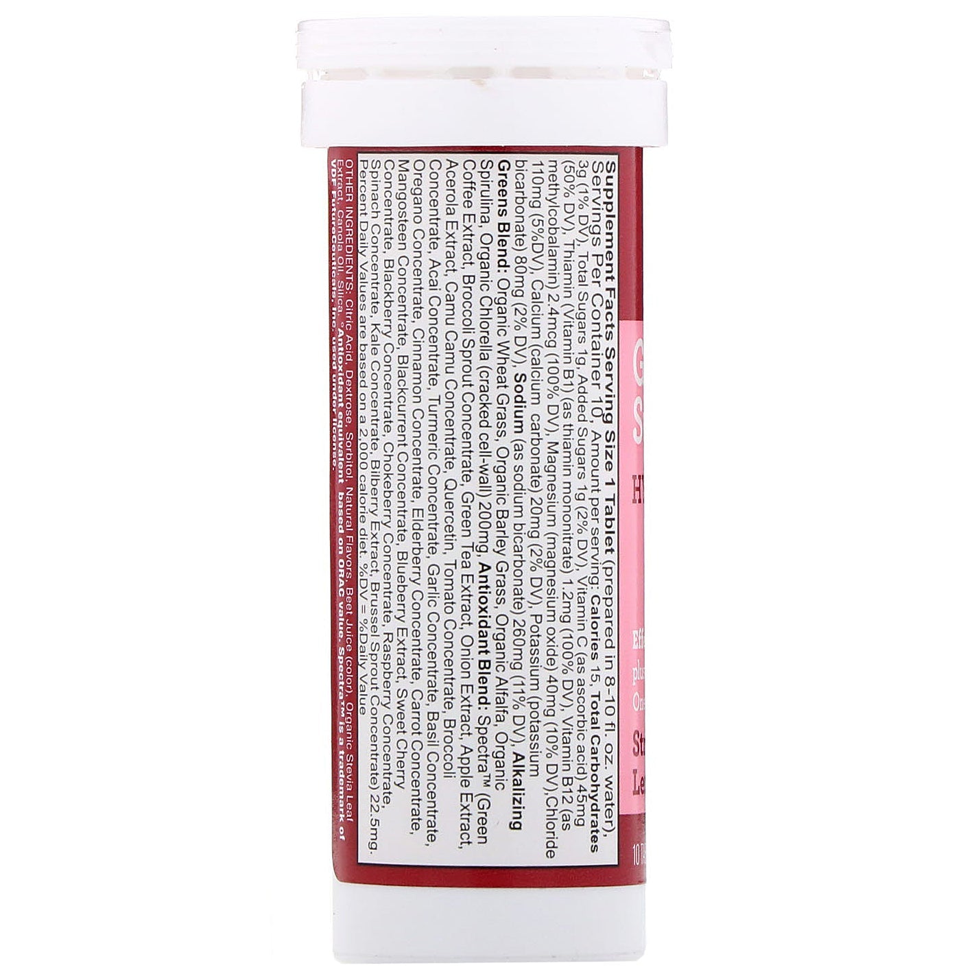 Serving Size: 1 Tablet (prepared in 8-10 fl. oz. water) Servings Per Container: 10 Amount Per Serving %Daily Value Calories 15 Total Carbohydrates 3 g 1% Total Sugars 1 g Added Sugars 1 g 2% Vitamin C (as ascorbic acid) 45 mg 50% Thiamin (Vitamin B1) (as thiamin mononitrate) 1.2 mg 100% Vitamin B12 (as methylcobalamin) 2.4 mcg 100% Magnesium (magnesium oxide) 40 mg 10% Chloride 110 mg 5% Calcium (calcium carbonate) 20 mg 2% Potassium (potassium bicarbonate) 80 mg 2% Sodium (as sodium bicarbonate) 260 mg 11% Alkalizing Greens Blends: Organic wheat grass, organic barley grass, organic alfalfa, organic spirulina, organic chlorella (cracked cell-wall) 200 mg Antioxidant Blend: Spectra (green coffee extract, broccoli sprout concentrate, green tea extract, onion extract, apple extract, acerola extract, camu camu concentrate, quercetin, tomato concentrate, broccoli concentrate, acai concentrate, turmeric concentrate, garlic concentrate, basil concentrate, oregano concentrate, cinnamon concentrate, elderberry concentrate, carrot concentrate, mangosteen concentrate, blackcurrant concentrate, blueberry extract, sweet cherry concentrate, blackberry concentrate, chokeberry concentrate, raspberry concentrate, spinach concentrate, kale concentrate, bilberry extract, brussel sprout concentrate) 22.5 mg Percent Daily Values are based on a 2,000 calorie diet. %DV = % Daily ValueDisclaimer