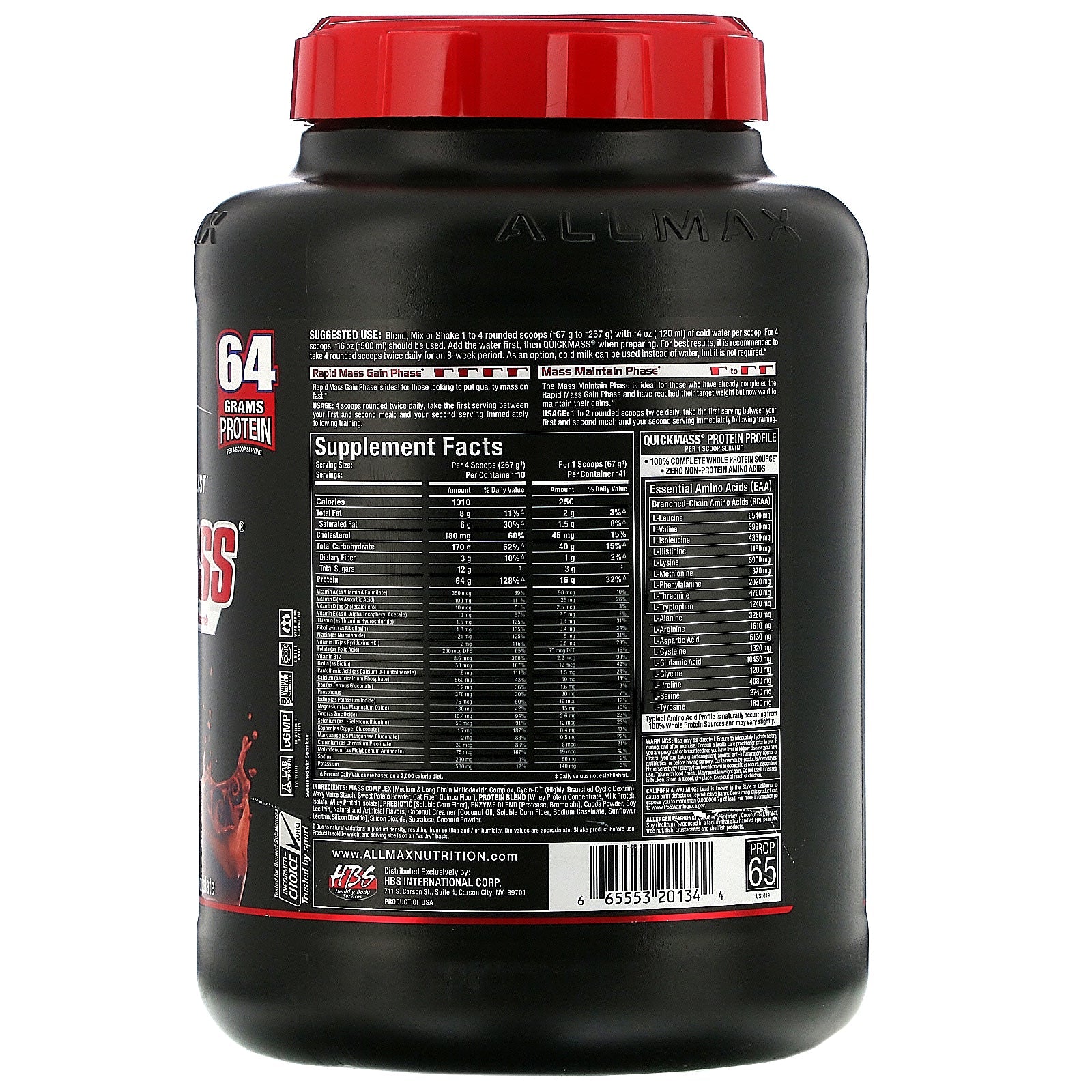 Science · Innovation · Quality · Results AM | PM | Post 60 Grams Protein - Per 4 Scoop Serving Based on Research at California State University Gain Lean Body Mass Fast 1010 Nutrient-Dense Calories Increase Calorie Activation 1010 Calories Zero Sugars Added 3:1 - Carb:Pro Dietary Supplement Natural & Artificial Flavors Informed Choice.org - Trusted by Sport Lab Tested - Every Ingredient Every Lot cGMP Registered Facility 100% Whole Protein Source Kosher Dairy No Artificial Color / Dye Sweetened with Sucralose Lean Mass Gains: Over 1,000 Calories per Serving! 1010 Calories Per Serving University Research-Based Science For Maximum Mass: Quickmass® packs 1010 Mass-Building Calories into every serving in cold water, no milk required! During one 8-week Gold-Standard (double-blind, placebo-controlled) study conducted at California State University, test subjects provided the same calorie content as 2 servings of Quickmass® per day gained 4.5 times as much fat-free mass and increased chest size by 1 inch. MassPro 60 g of Sustained Release Protein to Build Mass: MassPro™ creates a rapid and sustained delivery of muscle-building proteins that work continuously all day to help you recover and grow. Power up your Muscle Protein Synthesis and fuel your lean mass gains! Carb Plex Optimal 3:1 Carb to Protein Ratio: CarbPlex™ provides the calories your body needs to grow All Day with ultimate Mass Fuel for your gains! The Quickmass® carbohydrate blend is powered by healthy, long-chain and complex carbohydrates such as sweet potato, rolled oats and quinoa along with scientifically studied and tested carbs like Cyclo-D™ and VitaFiber™, a natural prebiotic. NP5 Technology Calorie Absorption Complex: Enhance your lean mass gains by absorbing nutrients better. Rapid gains in lean body mass depend on dramatic increases in calories and absorbing them! Patented Cinnulin PF®, a natural extract of cinnamon, dramatically enhances that way your body absorbs calories. Along with natural extracts of Prickly Pear and Bitter Melon, Quickmass® helps you absorb the highest quality nutrients efficiently to turn calories into Mass. Unsurpassed: The AllMax Quality Guaranteed Every ingredient added and every lot produced is laboratory-tested for purity and potency to ensure consistent product quality and integrity every time, guaranteed. 3rd Party Tested - Free of Banned Substances Quickmass® has been tested by an Independent 3rd Party Laboratory for Banned Substances.