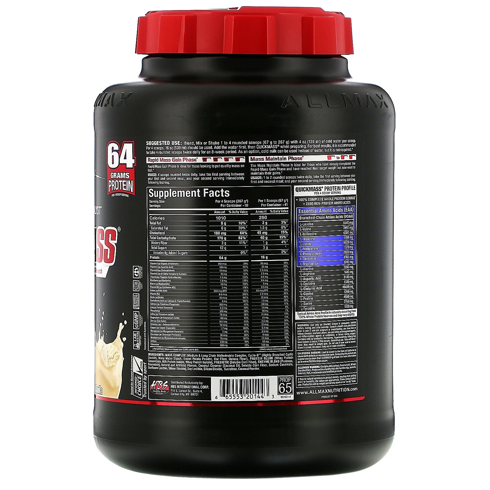 Science - Innovation - Quality - Results AM - PM - Post 60 Grams Protein - Per 4 Scoop Serving Based on Research at California State University Gain Lean Body Mass Fast 1010 Nutrient-Dense Calories Increase Calorie Activation 1010 Calories Zero Sugars Added 3:1 Carb:Pro Dietary Supplement Tested for Banned Substances Informed Choice - Trusted by Sport Lab Tested - Every Ingredient Every Lot cGMP Registered Facility 100% Whole Protein Source Kosher Dairy No Artificial Color / Dye Natural & Artificial Flavors, Sweetened with Sucralose Lean Mass Gains: Over 1,000 Calories per Serving! 1010 Calories Per Serving University Research-Based Science For Maximum Mass: Quickmass packs 1010 Mass-Building Calories into every serving in cold water, no milk required! During one 8-week Gold-Standard (double-blind, placebo-controlled) study conducted at California State University, test subjects provided the same calorie content as 2 servings of Quickmass per day gained 4.5 times as much fat-free mass and increased chest size by 1 inch. MassPro 60 g of Sustained Release Protein to Build Mass: MassPro creates a rapid and sustained delivery of muscle-building proteins that work continuously all day to help you recover and grow. Power up your Muscle Protein Synthesis and fuel your lean mass gains! Carb Plex Optimal 3:1 Carb to Protein Ratio: CarbPlex provides the calories your body needs to grow All Day with ultimate Mass Fuel for your gains! The Quickmass carbohydrate blend is powered by healthy, long-chain and complex carbohydrates such as sweet potato, rolled oats and quinoa along with scientifically studied and tested carbs like Cyclo-D and VitaFiber, a natural prebiotic. NP5 Technology Calorie Absorption Complex: Enhance your lean mass gains by absorbing nutrients better. Rapid gains in lean body mass depend on dramatic increases in calories and absorbing them! Patented Cinnulin PF, a natural extract of cinnamon, dramatically enhances that way your body absorbs calories. Along with natural extracts of Prickly Pear and Bitter Melon, Quickmass helps you absorb the highest quality nutrients efficiently to turn calories into Mass. Unsurpassed: The AllMax Quality Guaranteed Every ingredient added and every lot produced is laboratory-tested for purity and potency to ensure consistent product quality and integrity every time, guaranteed. Quickmass goes through the exclusive Allmax 5-stage quality testing protocol. 3rd Party Tested - Free of Banned Substances Quickmass has been tested by an Independent 3rd Party Laboratory for Banned Substances.