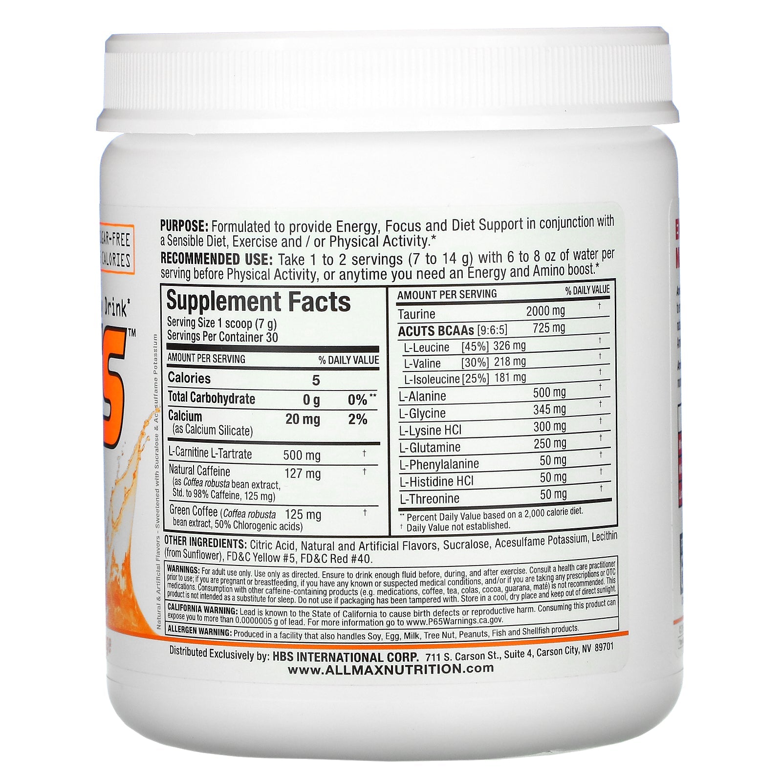 Serving Size: 1 scoop (7 g) Servings Per Container: 30 Amount Per Serving % Daily Value Calories 5 Total Carbohydrate 0 g 0%** Calcium (as Calcium Silicate) 20 mg 2% L-Carnitine L-Tartrate 500 mg † Natural Caffeine (as Coffea robusta bean extract, Std. to 98% Caffeine, 125 mg) 127 mg † Green Coffee (Coffea robusta bean extract, 50% Chlorogenic acids) 125 mg † Taurine 2000 mg † ACUTS BCAAs [9:6:5] 725 mg L-Leucine [45%] 326 mg † L-Valine [30%] 218 mg † L-Isoleucine [25%] 181 mg † L-Alanine 500 mg † L-Glycine 345 mg † L-Lysine HCl 300 mg † L-Glutamine 250 mg † L-Phenylalanine 50 mg † L-Histidine HCl 50 mg † L-Threonine 50 mg † ** Percent Daily Value based on a 2,000 calorie diet † Daily Value not establishedDisclaimer