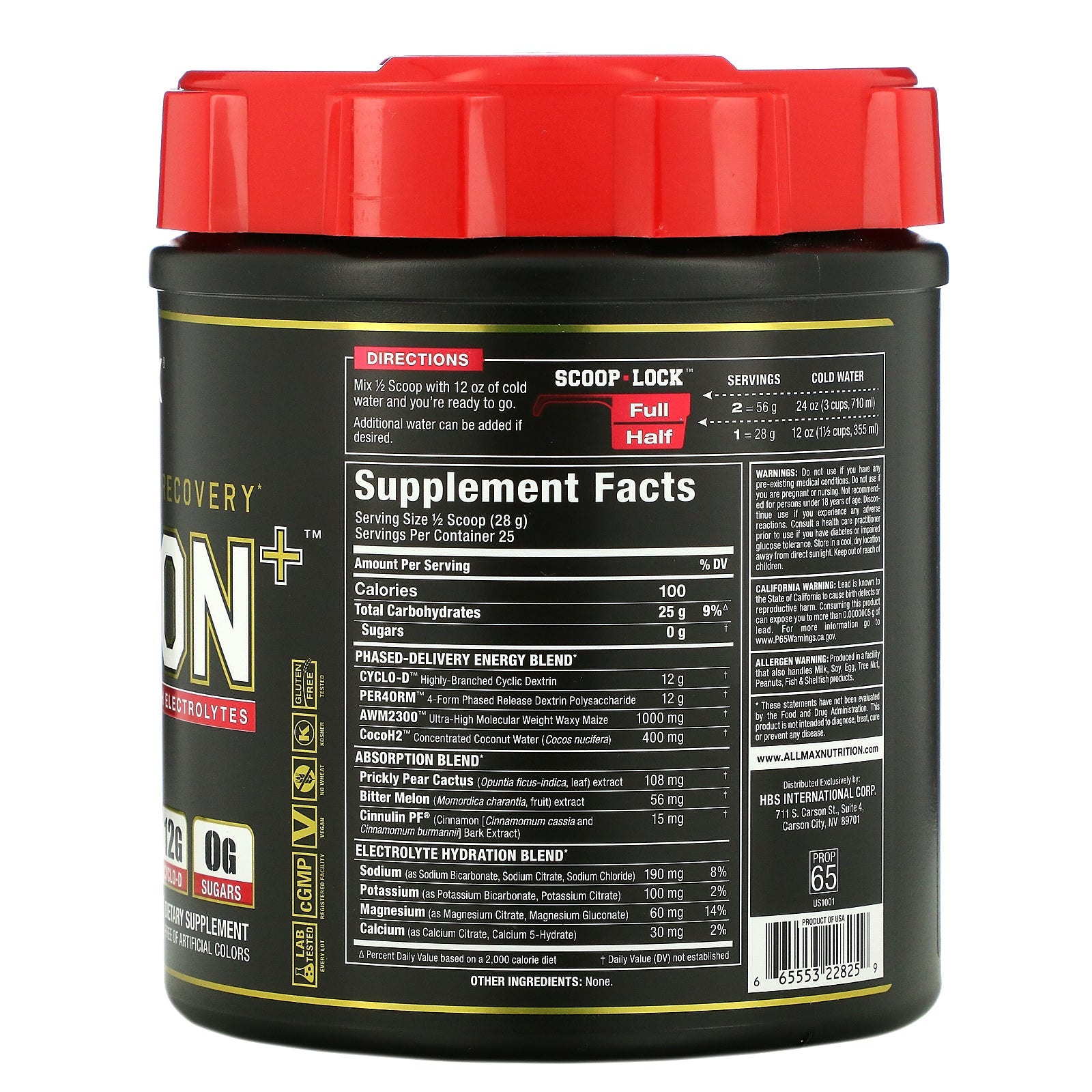 Serving Size: 1/2 Scoop (28 g) Servings Per Container: 25 Amount Per Serving % Daily Value Calories 100 Total Carbohydrates 25 g 9%▵ Sugars 0 g † Phased-Delivery Energy Blend* Cyclo-D™ Highly-Branched Cyclic Dextrin 12 g † PER4ORM™ 4-Form Phased Release Dextrin Polysaccharide 12 g † AWM2300™ Ultra-High Molecular Weight Waxy Maize 1000 mg † CocoH2™ Concentrated Coconut Water (Cocos nucifera) 400 mg † Absorption Blend* Prickly Pear Cactus (Opuntia ficus-indica, leaf) extract 108 mg † Bitter Melon (Momordica charantia, fruit) extract 56 mg † Cinnulin PF ® (Cinnamon [Cinnamomum cassia and cinnamomum burmannii] bark extract) 15 mg † Electrolyte Hydration Blend* Sodium (as Sodium Bicarbonate, Sodium Citrate, Sodium Chloride) 190 mg 8% Potassium (as Potassium Bicarbonate, Potassium Citrate) 100 mg 2% Magnesium (as Magnesium Citrate, Magnesium Gluconate) 60 mg 14% Calcium (as Calcium Citrate, Calcium 5-Hydrate) 30 mg 2% ▵Percent Daily Values are based on a 2,000 calorie diet. †Daily Value (DV) not established.Disclaimer