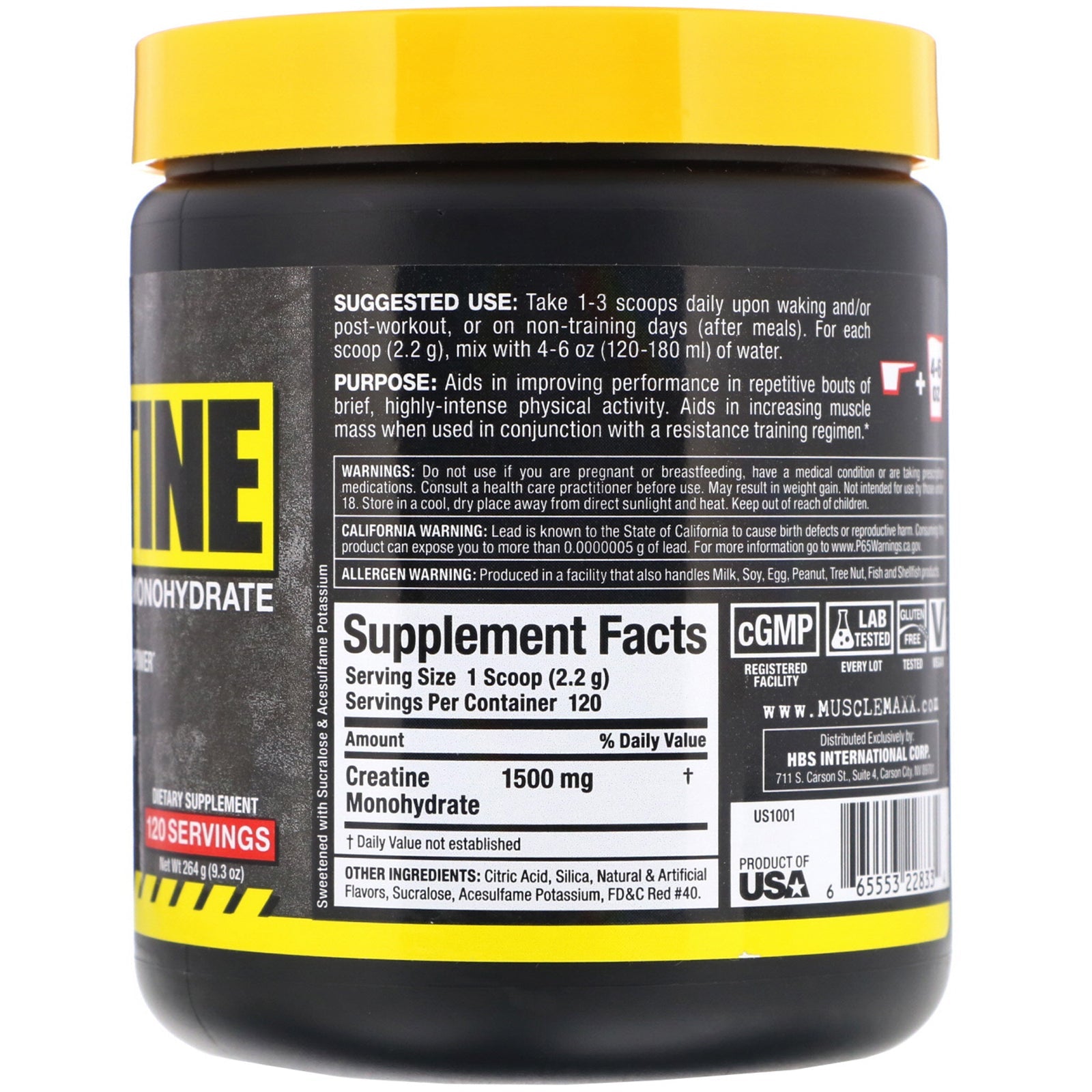 Muscle-Building Micronized Creatine Monohydrate + Increases Maximum Strength & Power + Helps Build Lean Muscle Mass + Enhances Endurance & Recovery Natural & Artificial Flavors Dietary Supplement 120 Servings Sweetened with Sucralose & Acesulfame Potassium cGMP Registered Facility Lab Tested Gluten Free Tested Vegan Purpose: Aids in improving performance in repetitive bouts of brief, highly-intense physical activity. Aids in increasing muscle mass when used in conjunction with a resistance training regimen. Stimulate Protein Synthesis Boost Cell Volumization Enhance ATP Preservation & Recovery Maxximize Mass Strength Endurance MMX Creatine gives you all the benefits of Creatine with the delicious taste of Fruit Punch. Creatine is essential for anyone looking to build lean muscle mass, improve workout performance, and enhance strength and power. Creatine Monohydrate is the most heavily researched and studied sports nutrition supplement. It had been proven time and time again to be the safest and most effective ingredient for...