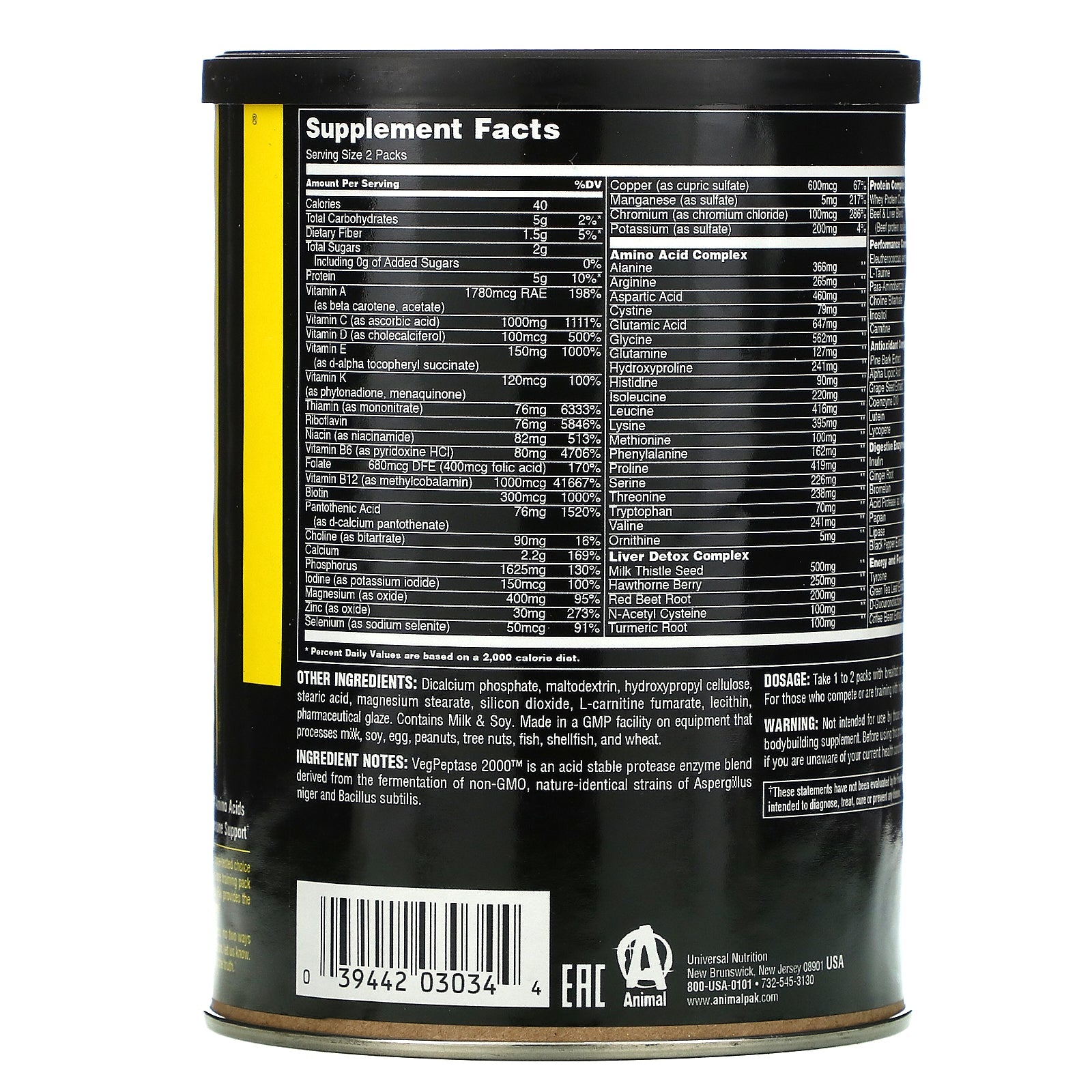 Serving Size: 2 packs Amount Per Serving %DV Calories 40 Total Carbohydrates 5 g 2%* Dietary Fiber 1.5 g 5%* Total Sugars 2 g Including 0 g of Added Sugars 0% Protein 5 g 10%* Vitamin A (as beta carotene, acetate) 1780 mcg RAE 198% Vitamin C (as ascorbic acid) 1000 mg 1111% Vitamin D (as cholecalciferol) 100 mcg 500% Vitamin E (as d-alpha tocopheryl succinate) 150 mg 1000% Vitamin K (as phytonadione, menaquinone) 120 mcg 100% Thiamin (as mononitrate) 76 mg 6333% Riboflavin 76 mg 5846% Niacin (as niacinamide) 82 mg 513% Vitamin B6 (as pyridoxine HCl) 80 mg 4706% Folate 680 mcg DFE (400 mcg folic acid) 170% Vitamin B12 (as methylcobalamin) 1000 mcg 41667% Biotin 300 mcg 1000% Pantothenic Acid (as d-calcium pantothenate) 76 mg 1520% Choline (as bitartrate) 90 mg 16% Calcium 2.2 g 169% Phosphorus 1625 mg 130% Iodine (as potassium iodide) 150 mcg 100% Magnesium (as oxide) 400 mg 95% Zinc (as oxide) 30 mg 273% Selenium (as sodium selenite) 50 mcg 91% Copper (as cupric sulfate) 600 mcg 67% Manganese (as sulfate) 5 mg 217% Chromium (as chromium chloride) 100 mcg 286% Potassium (as sulfate) 200 mg 4% Amino Acid Complex Alanine 366 mg ** Arginine 265 mg ** Aspartic Acid 460 mg ** Cystine 79 mg ** Glutamic Acid 647 mg ** Glycine 562 mg ** Glutamine 127 mg ** Hydroxyproline 241 mg ** Histidine 90 mg ** Isoleucine 220 mg ** Leucine 416 mg ** Lysine 395 mg ** Methionine 100 mg ** Phenylalanine 162 mg ** Proline 419 mg ** Serine 226 mg ** Threonine 238 mg ** Tryptophan 70 mg ** Valine 241 mg ** Ornithine 5 mg ** Liver Detox Complex Milk Thistle Seed 500 mg ** Hawthorne Berry 250 mg ** Red Beet Root 200 mg ** N-Acetyl Cysteine 100 mg ** Turmeric Root 100 mg ** Protein Complex Whey Protein Concentrate 3500 mg ** Beef & Liver Blend (Beef protein isolate, liver) 2830 mg ** Performance Complex Eleutherococcus senticosus (root) 1000 mg ** L-Taurine 500 mg ** Para-Aminobenzoic Acid (PABA) 400 mg ** Choline Bitartrate 250 mg ** Inositol 125 mg ** Carnitine 25 mg ** Antioxidant Complex Pine Bark Extract 200 mg ** Alpha Lipoic Acid 100 mg ** Grape Seed Extract 50 mg ** Coenzyme Q10 5 mg ** Lutein 1 mg ** Lycopene 1 mg ** Digestive Enzyme and Absorption Complex Inulin 250 mg ** Ginger Root 200 mg ** Bromelain 100 mg ** Acid Protease as VegPeptase ™ 64 mg ** Papain 64 mg ** Lipase 10 mg ** Black Pepper Extract (fruit) as BioPerine ® 2.5 mg ** Energy and Focus Complex Tyrosine 315 mg ** Green Tea Leaf Extract 100 mg ** D-Glucuronolactone 100 mg ** Coffee Bean Extract (polyphenols) 100 mg ** * Percent Daily Values are based on a 2,000 calorie diet. ** Daily Value (DV) not established.Disclaimer
