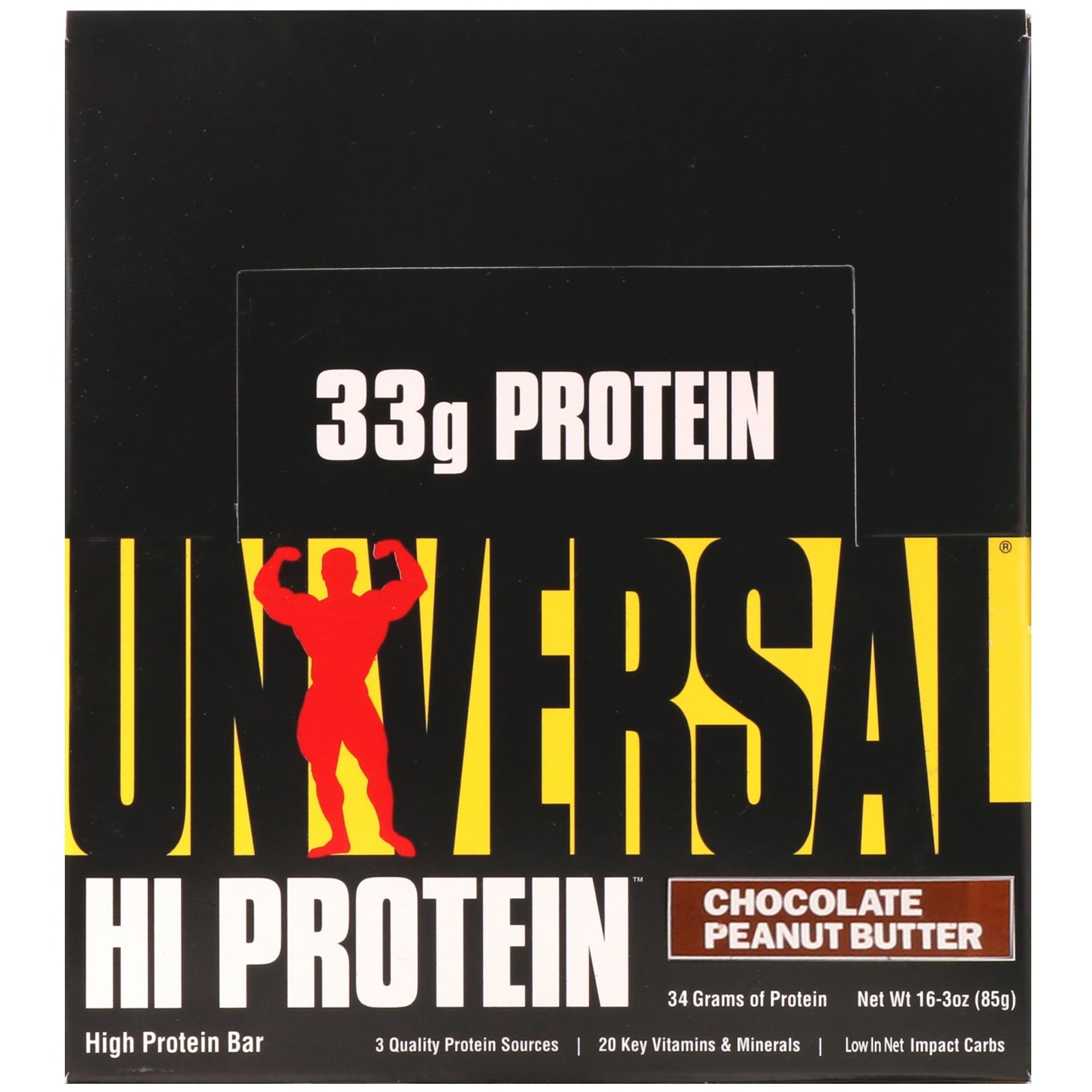 34 Grams of Protein 3 Quality Protein Sources 20 Key Vitamins & Minerals Low in Net Impact Carbs WHO WE ARE Universal Nutrition has been providing cutting edge and staple nutritional products to bodybuilders and hard training athletes the world over since 1977. As time passes, certain ideals never go out of style. Honesty. Integrity. Respect. These are the values we uphold are the bedrock upon which we built our business. WHAT IT IS Universal's Hi Protein Bar is jam-packed with 34 grams of quality protein. And with 3 grams of net impact carbs per bar, you get more protein and less carbs for your buck. HOW WE BACK IT UP What is on the label is in the box and what is in the box will help you reach your goals. We believe it and proudly stand behind every product we manufacture. Our word is our bond.