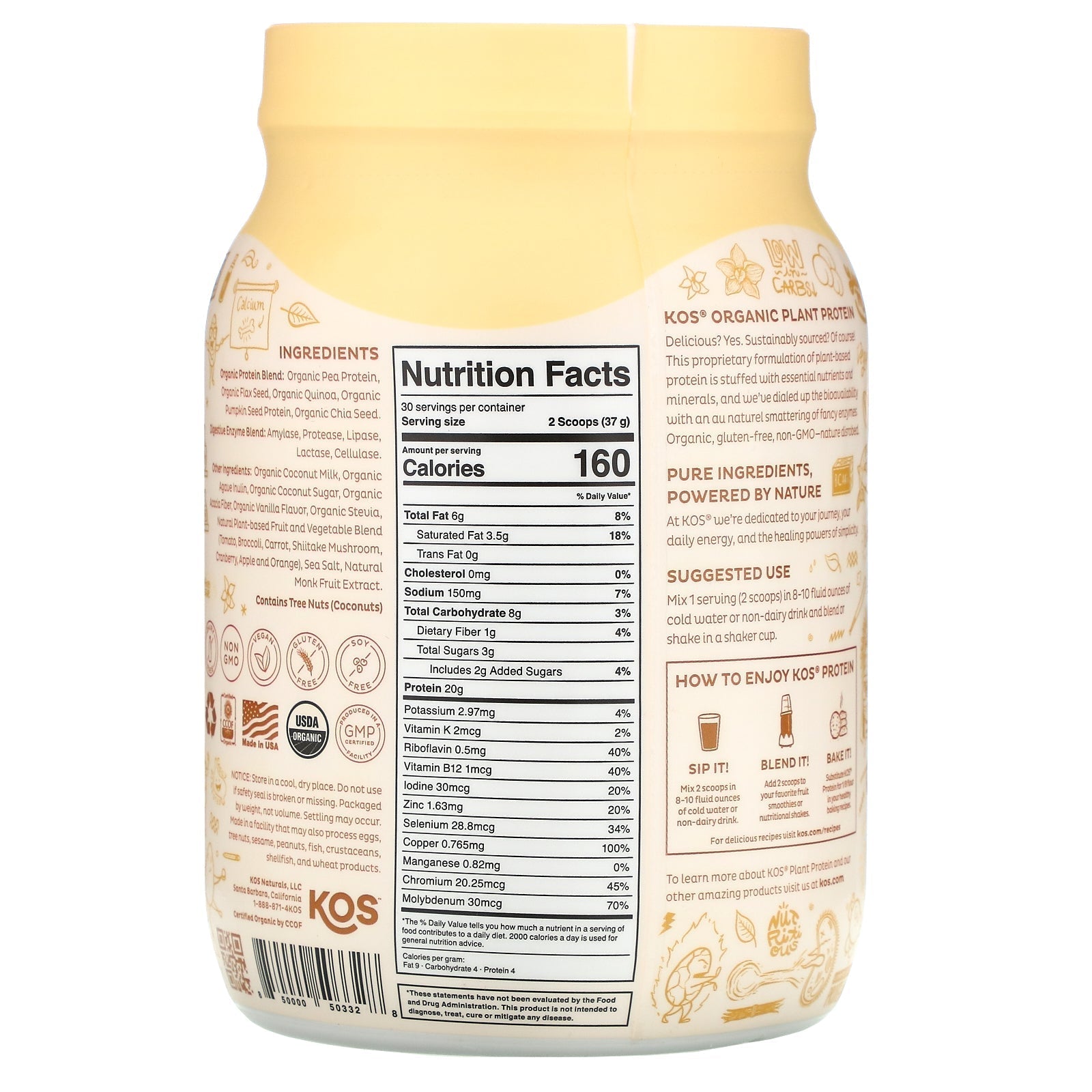 Nature-Powered 20 g Protein 160 Calories Scoop, Shake, Smile Dairy Free Non GMO Vegan Gluten Free Soy Free Certified by CCOF USDA Produced in a GMP Certified Facility KOS® Plant Protein Delicious? Yes.Sustainably sourced? Of course! This proprietary formulation of plant-based protein is stuffed with essential nutrients and minerals, and we've dialed up the bioavailability with an au naturel smattering of fancy enzymes., gluten-free, non-GMO-nature disrobed. Pure Ingredients, Powered by Nature At KOS® we're dedicated to your journey, your daily energy, and the healing powers of simplicity.