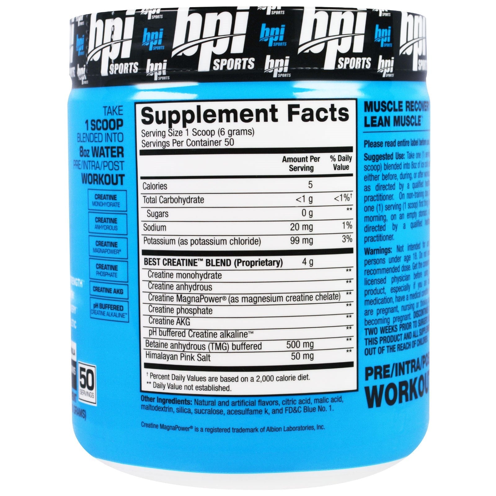 Be Better. Be Stronger. BPI. Natural and Artificial Flavors Zero Sugar Pro Strength Creatine Blend† Professional Formula Dietary Supplement 50 Servings Muscle Recovery Lean Muscle† Pre/Intra/Post Workout† Recovery† 6 Advanced Forms of Creatine Creatine - Monohydrate Creatine - Anhydrous Creatine - MagnaPower Creatine - Phosphate Creatine AKG pH Buffered - Creatine Alkaline May Increase: Increased Strength† Muscle Growth† Optimal Recovery† Improved Athletic Performance† † When combined with a proper exercise and nutrition regimen. Statements based on early-stage independent 3rd party in vivo and / or in vitro model scientific research data findings for individual ingredients.